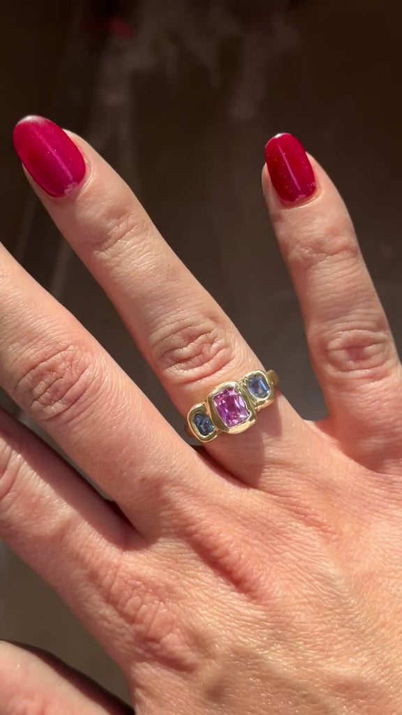 This statement ring features a 10mm heart-shaped pink sapphire with sparkling pink sapphire side stones, set in recycled sterling silver or solid yellow gold.