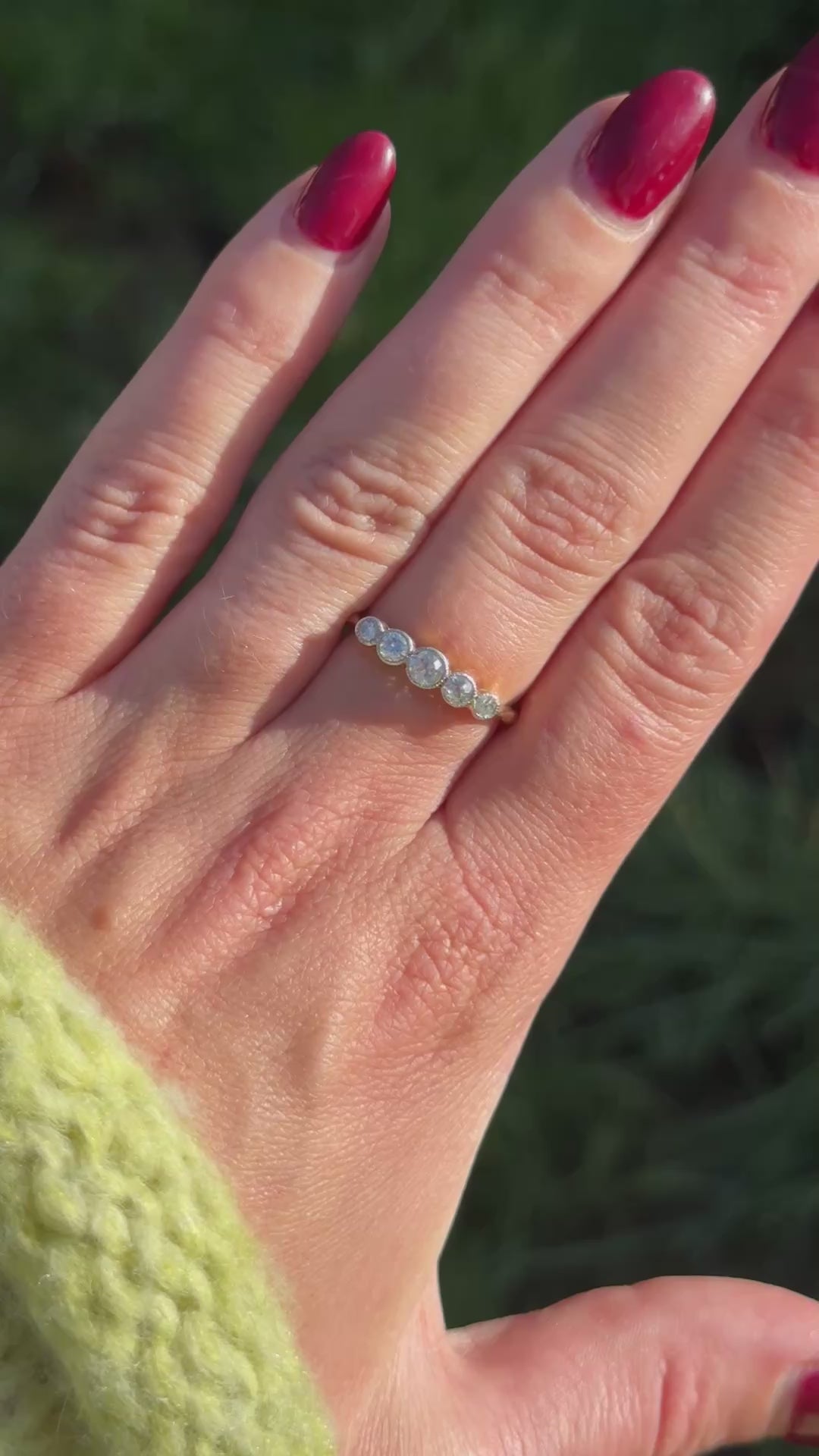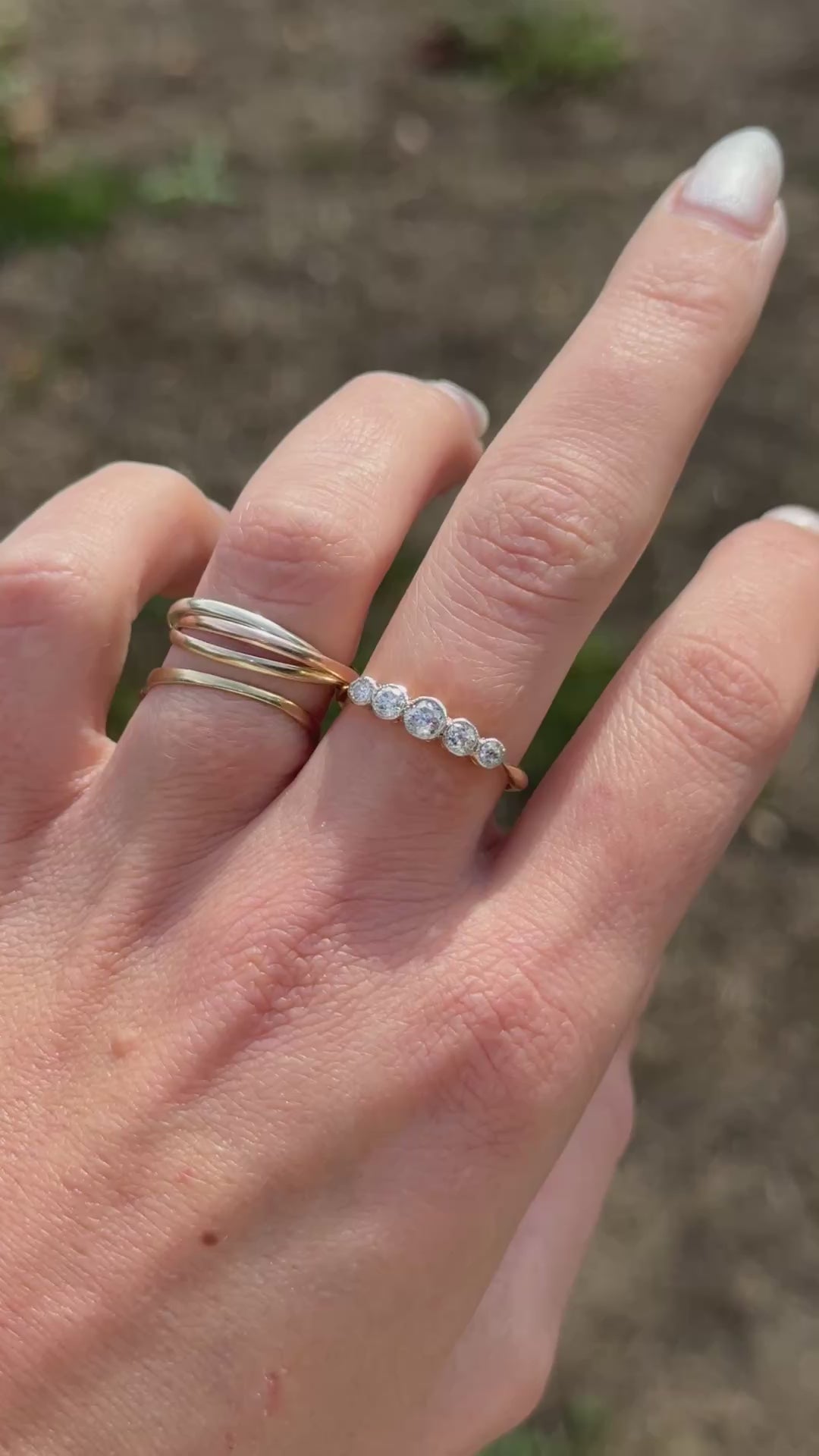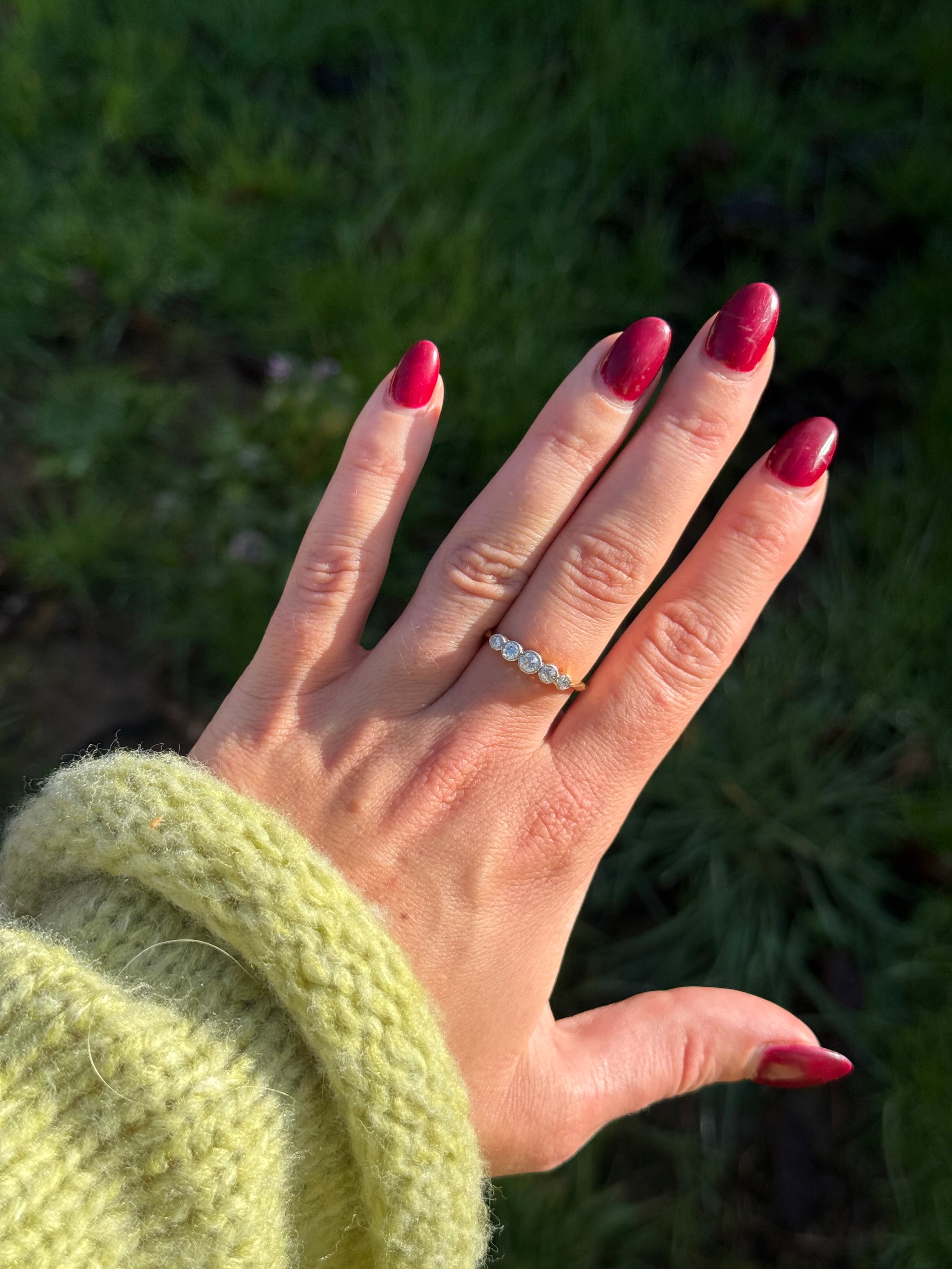 A vintage treasure found by Molly: The Diamond Angel Ring is a breathtaking five- natural diamonds in a row. Crafted in secure platinum bezel set and beautifully complemented by an 18ct yellow gold for the rest of the ring design. it creates a stunning harmony of style and sophistication. This exceptional ring is a true standout for any collection, perfect to wear alone or stacked with your other favourite rings.