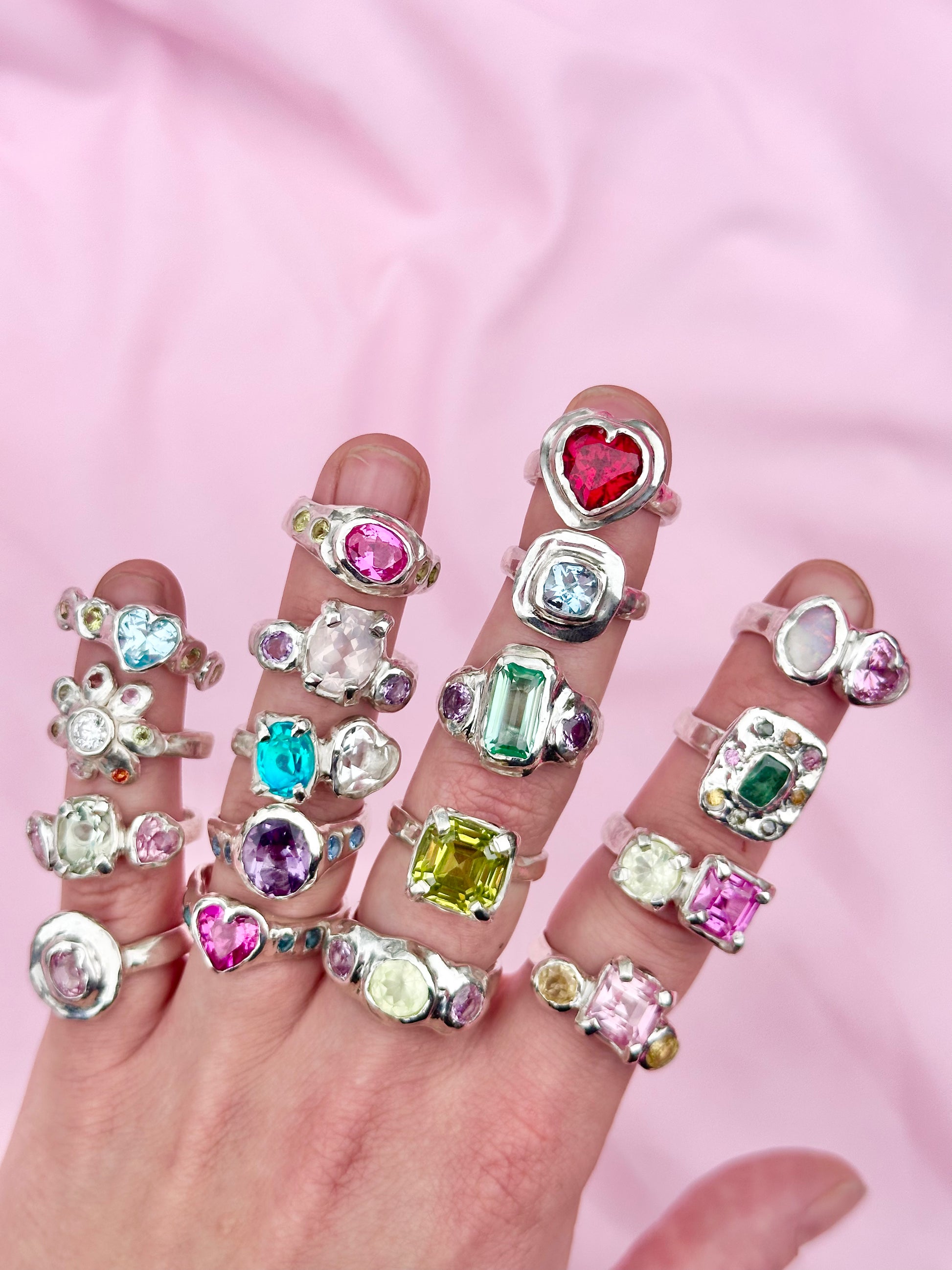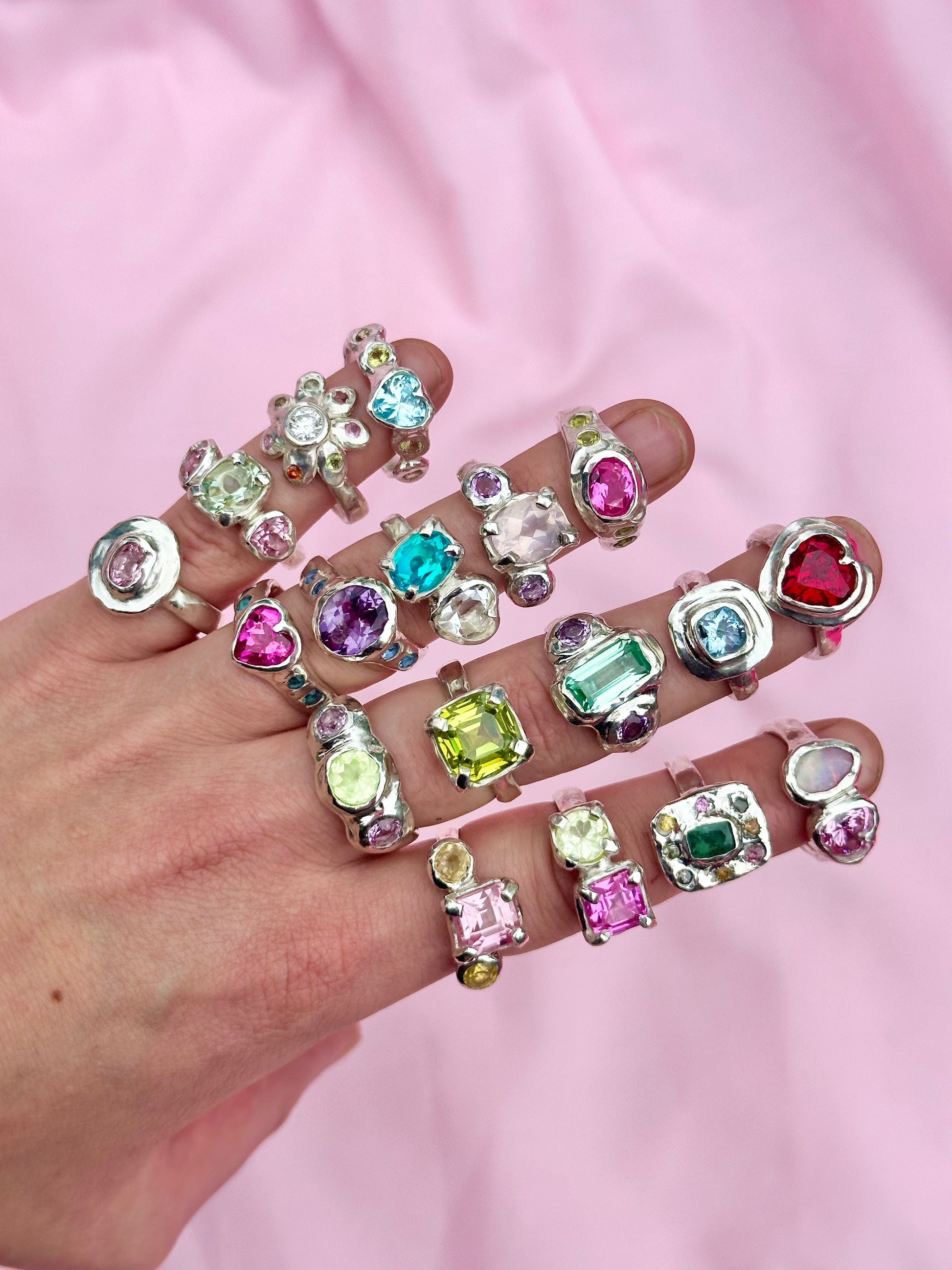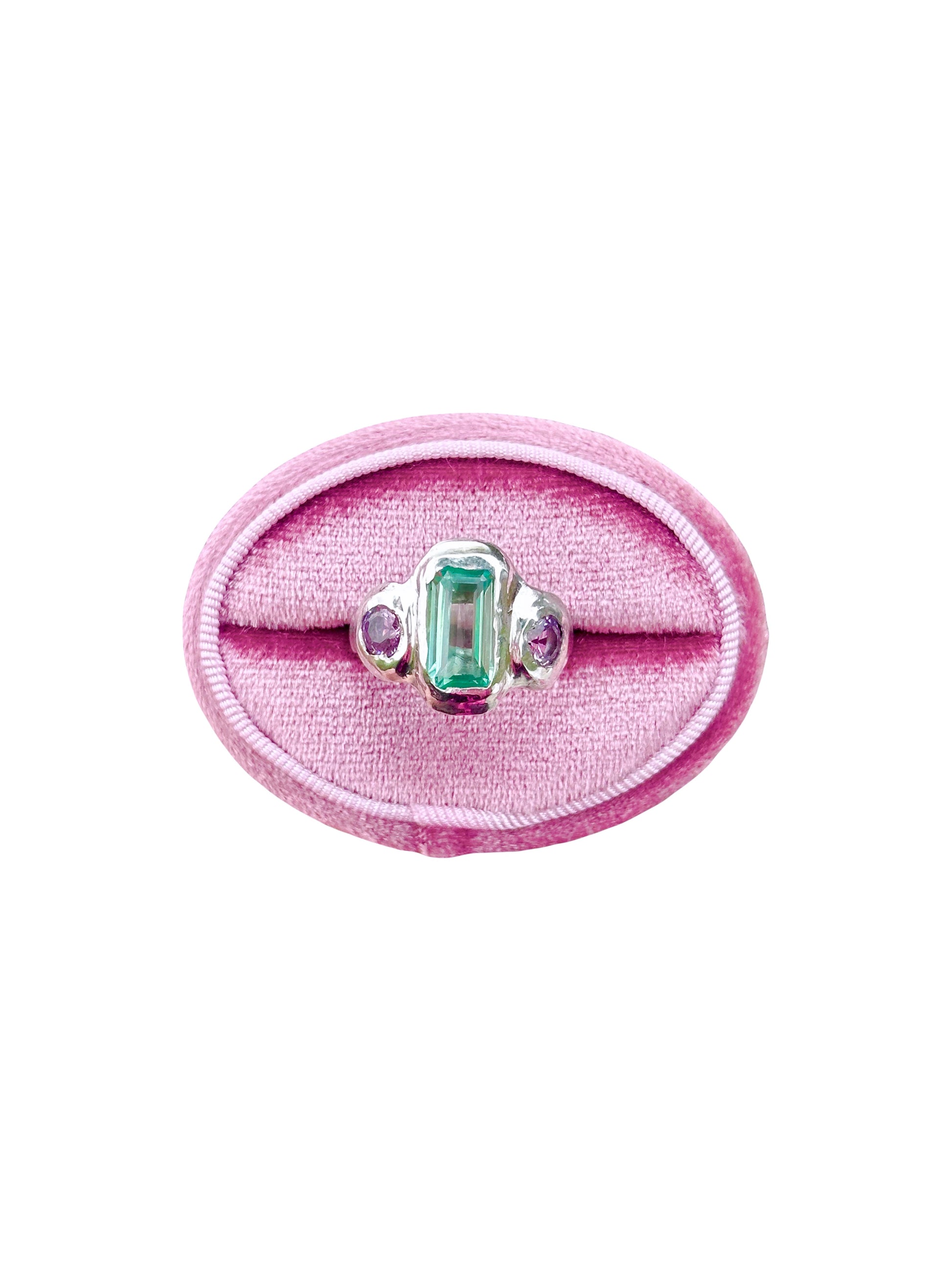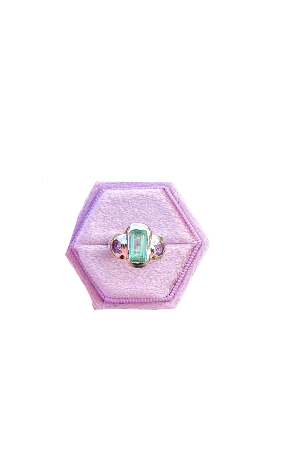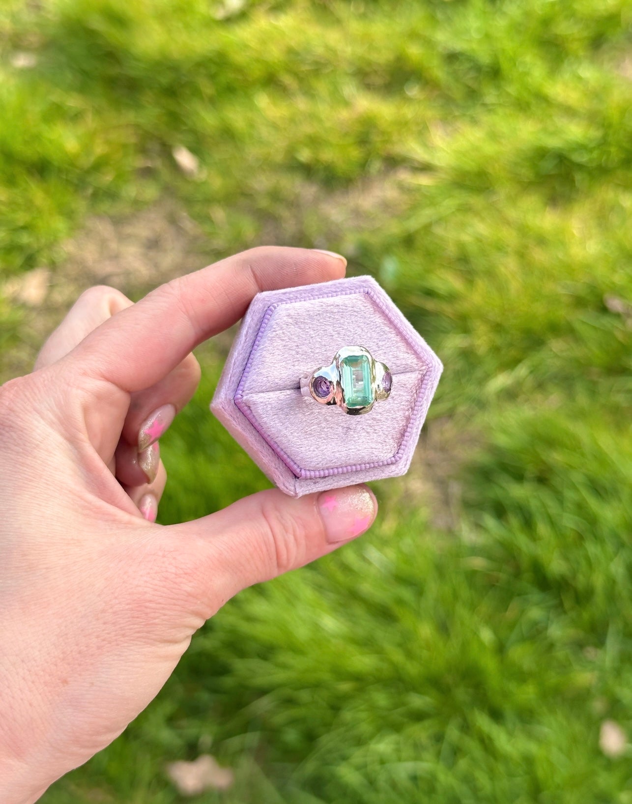 Our Silver Stage ring features a stunning sage green tourmaline at the centre, and beautiful natural lavender Amethysts. The soft green of the tourmaline pairs effortlessly with the vibrant pink sapphires.