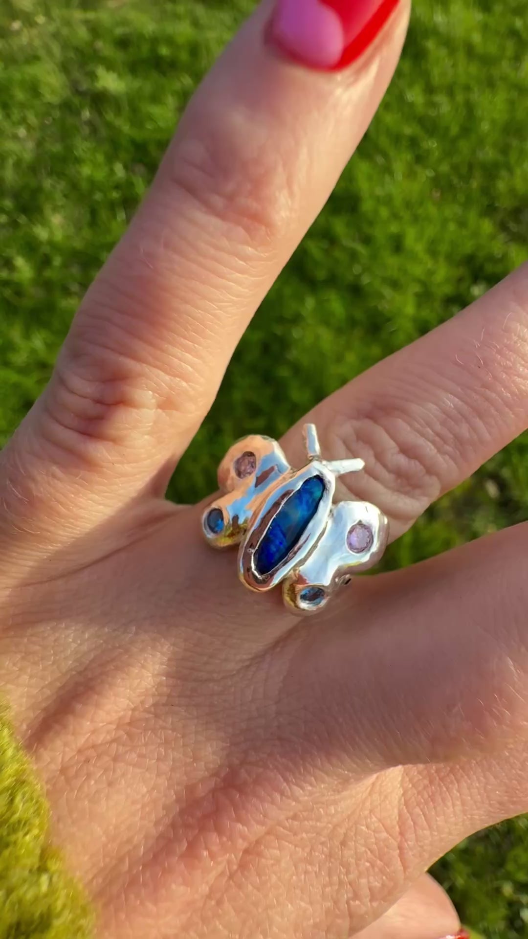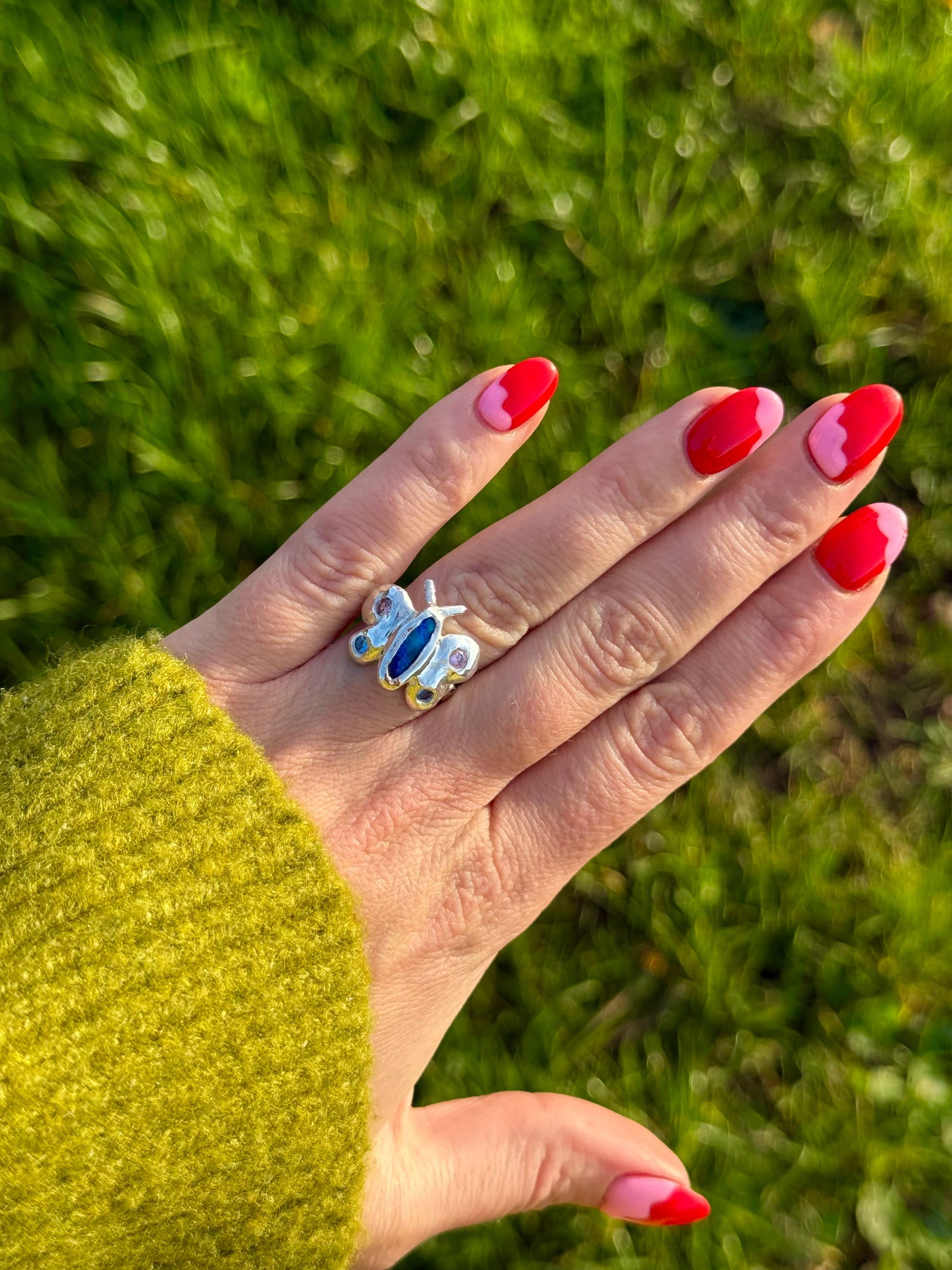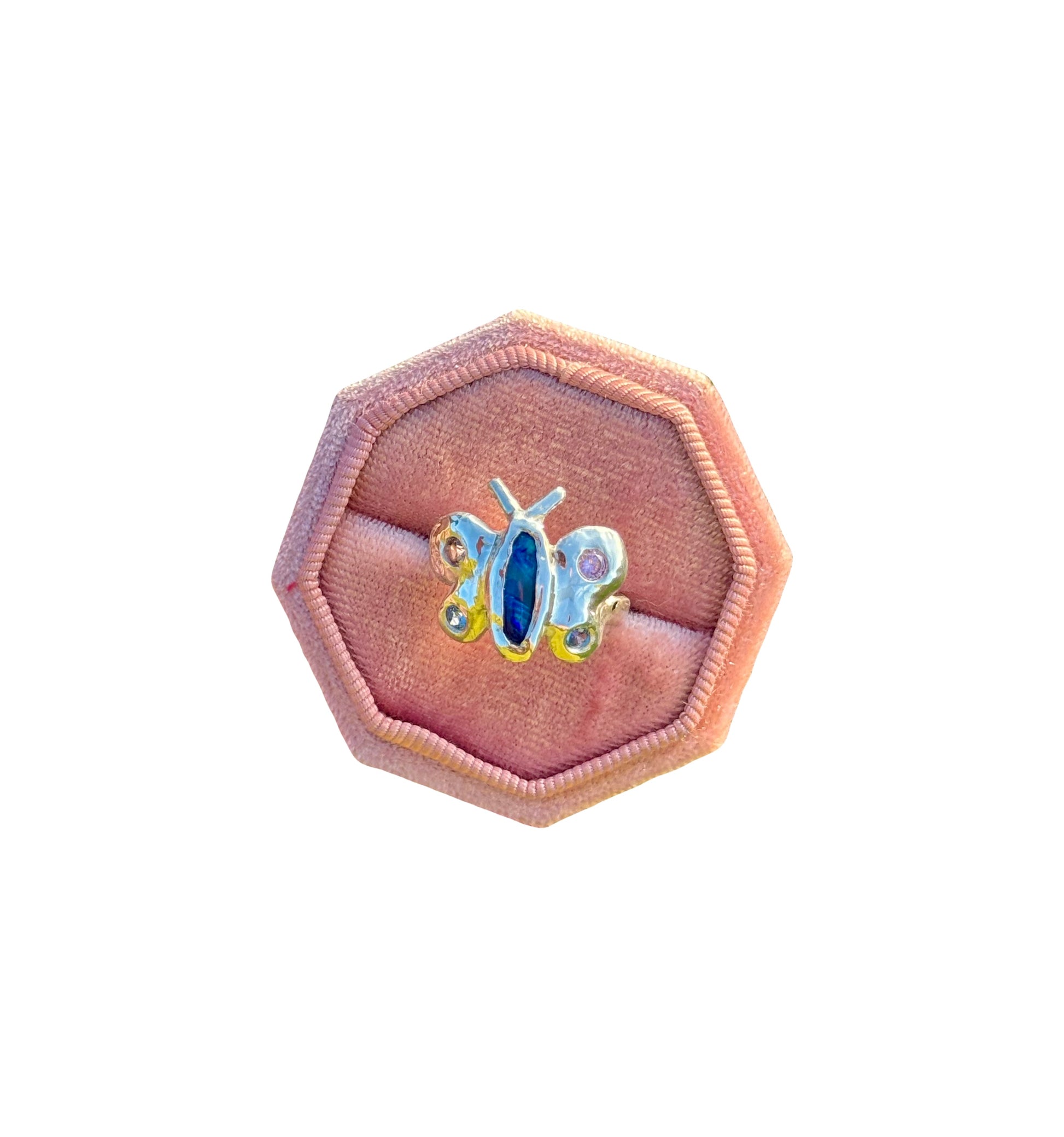Blue the Butterfly Ring is handcrafted in solid sterling silver and features a vibrant Australian blue opal at her centre. Her delicate wings are adorned with a dreamy blend of pink and blue sapphires, shimmering softly as they catch the light.