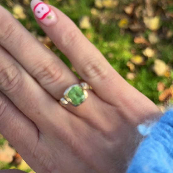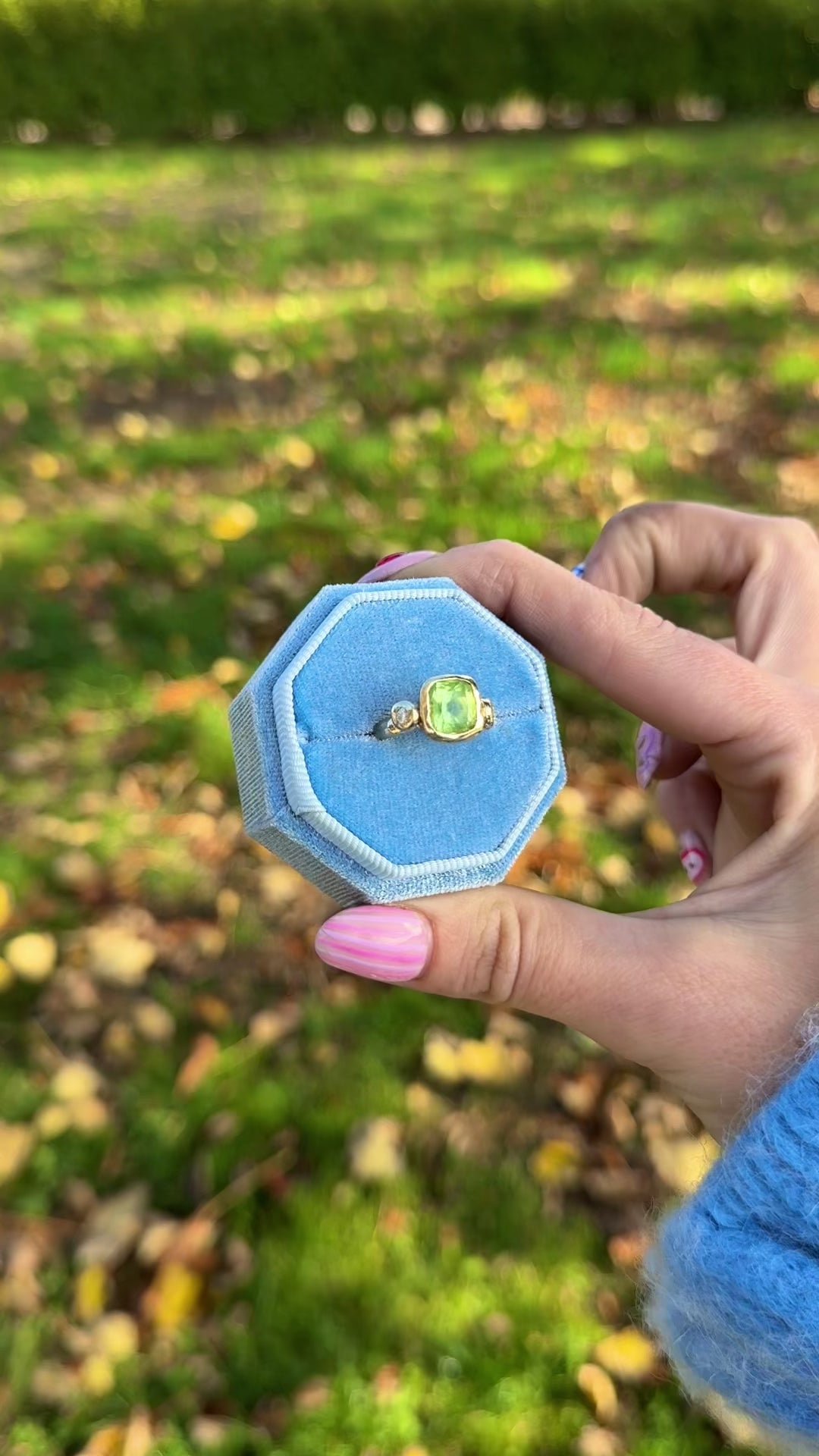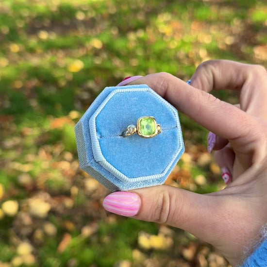 Bright and refreshing, Peridot Pop features a beautiful natural peridot at the centre, set in solid 9ct yellow gold. A diamond on each side adds a touch of sparkle, highlighting the lively green hue of the centre stone.