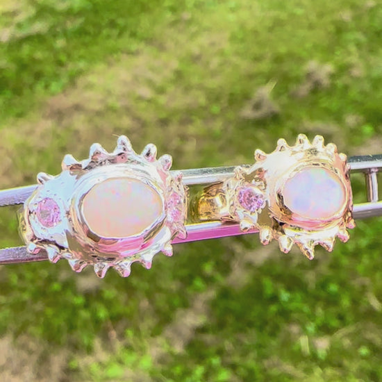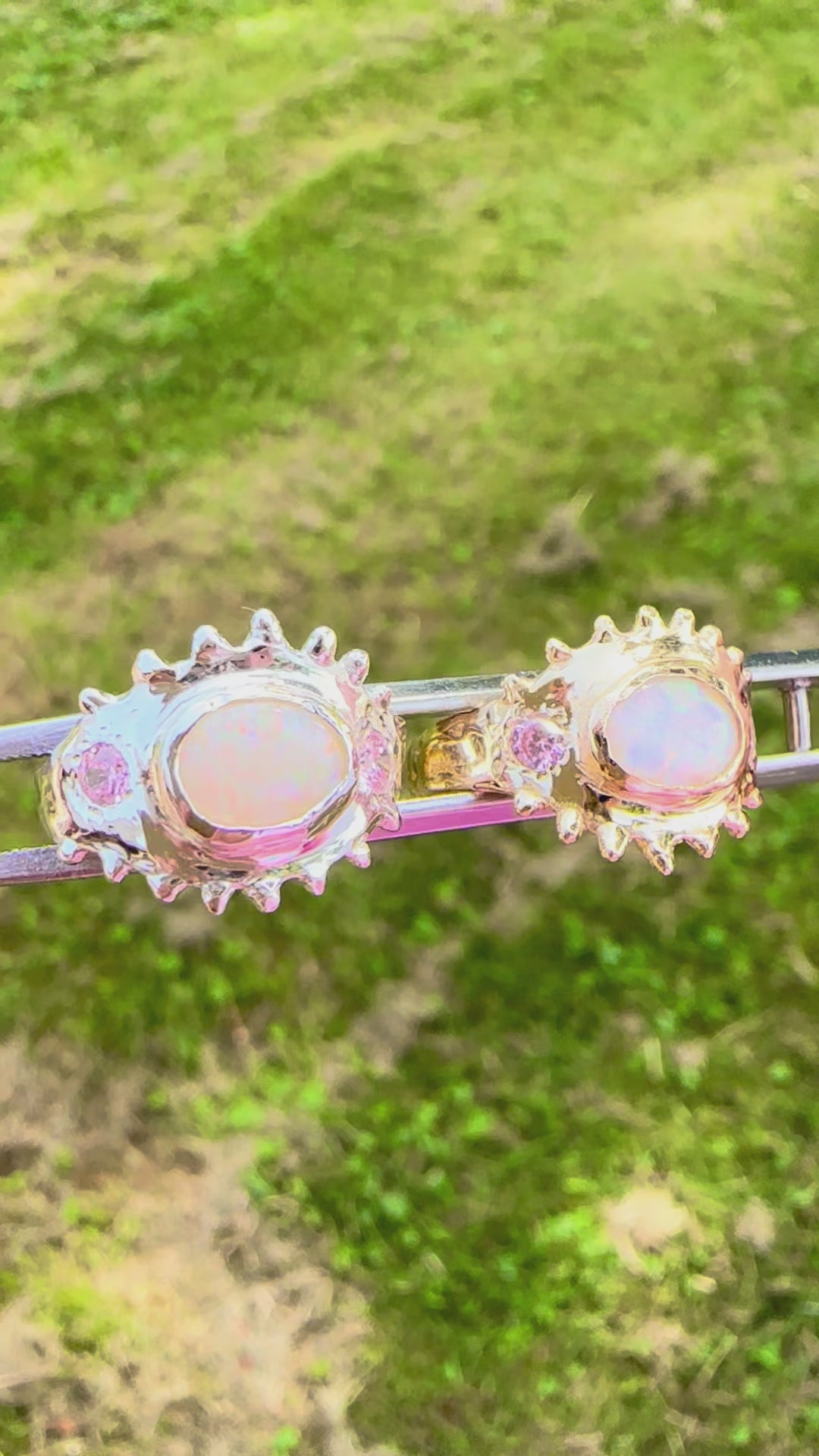 The Orla ring in either solid 9ct yellow gold, 14ct yellow gold or sterling silver showcasing a radiant white Australian opal accented with delicate pale pink sapphires. The opal sparkles with a mesmerising play of colour as it catches the light, creating a stunning display of shifting hues.