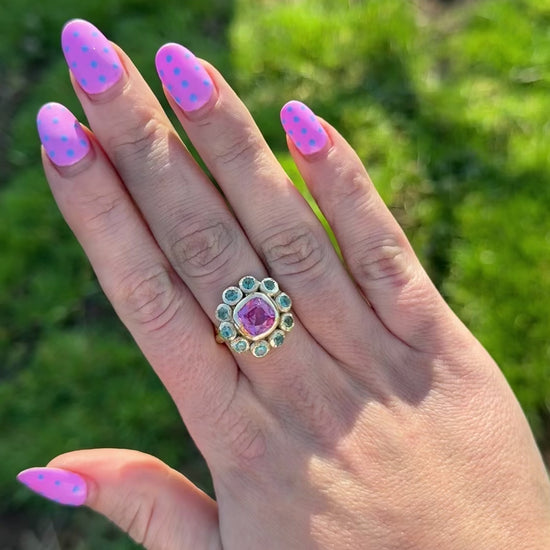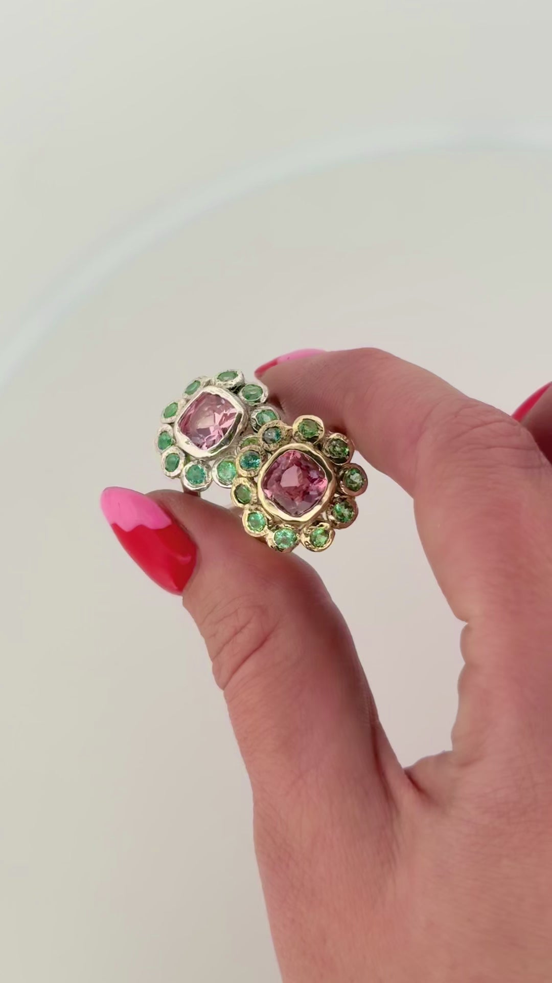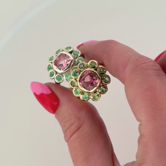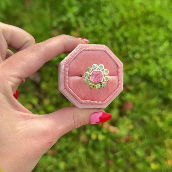 Discover our made-to-order Treasure Ring, a true celebration of colour! Available in sterling silver, 9ct yellow gold, or 14ct gold, each ring is designed to be uniquely yours. At its heart lies a stunning pink cushion cut sapphire, delicately embraced by a halo of mint-coloured nanos.