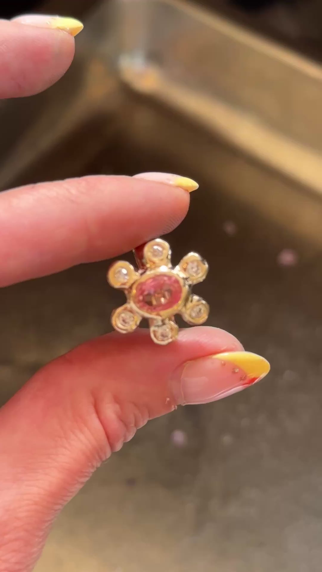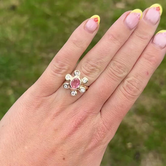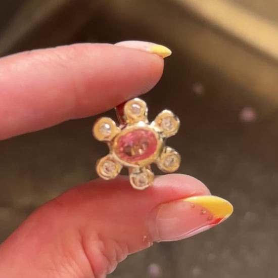 Our stunning, made-to-order Sunshine Ring features a beautiful pale pink natural Tourmaline at its centre, surrounded by your choice of 6 Lab-Diamonds or 6 Cubic Zirconias (which closely resemble diamonds and offer a more affordable option).