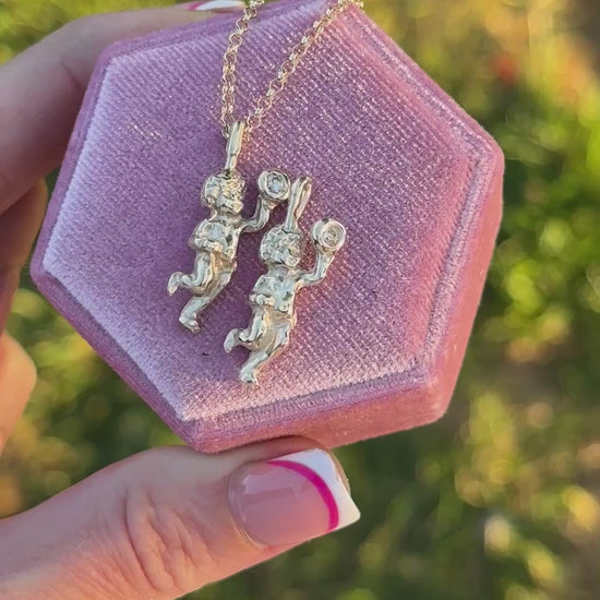 Our Putto Necklace in solid 9ct gold features a sweet, detailed cherub holding a sparkling lab- diamond in its hand. Cherubs symbolise love, protection, and divine intervention, making this piece not only beautiful but also meaningful. We believe wearing this necklace you'll have your guardian angel close to your heart. This comes with a solid gold 16 or 17inch adjustable chain. Please put in notes what length you would like.