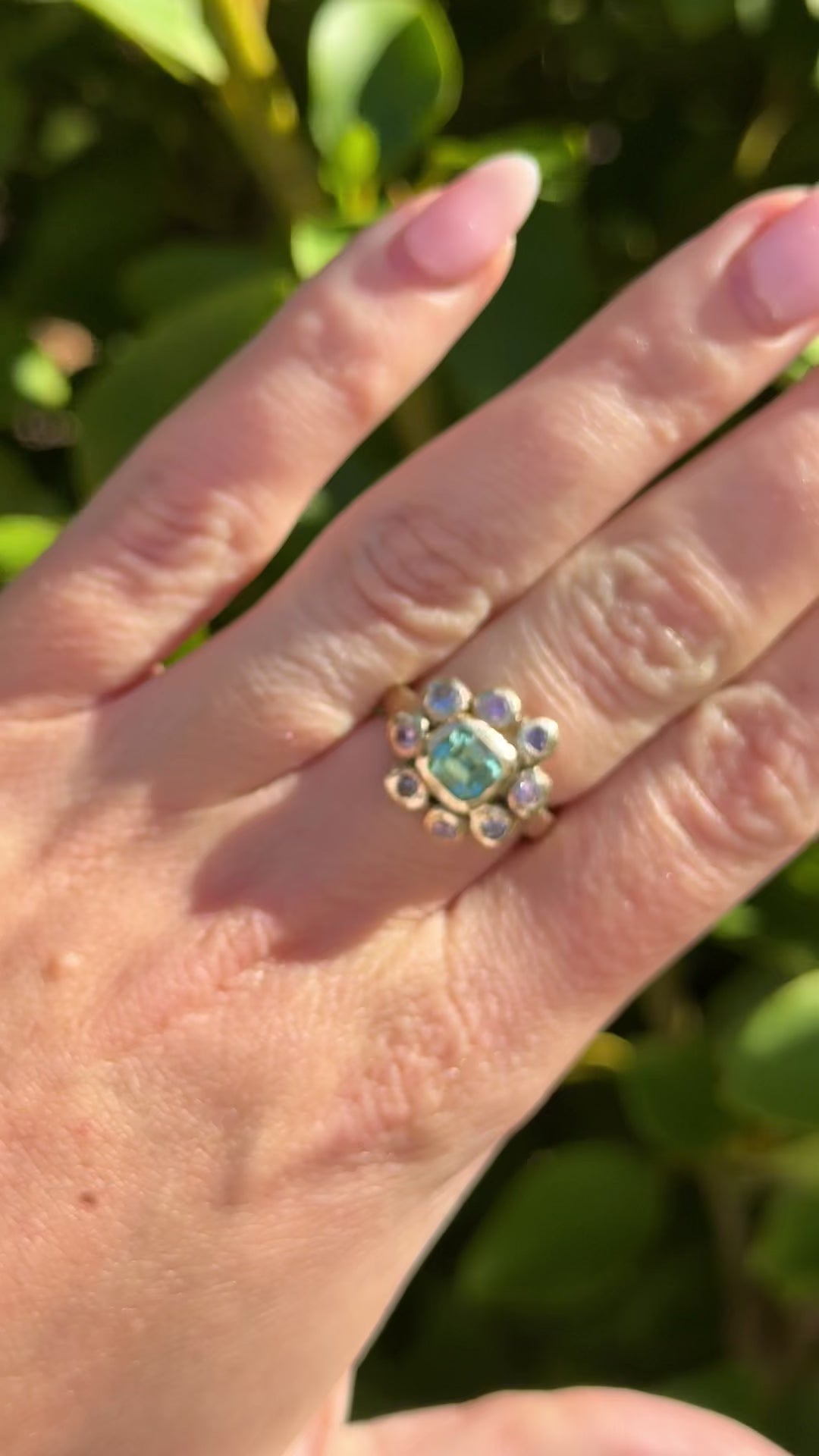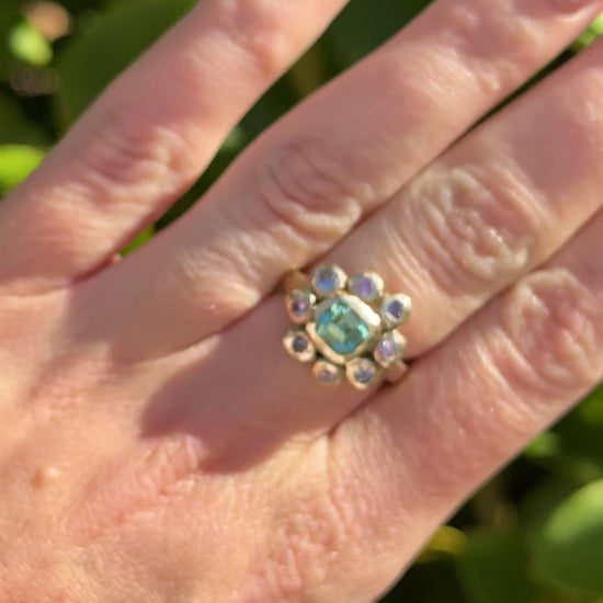 Iris Ring this One-Off Wonder ring features a vibrant green tourmaline at its centre, surrounded by delicate pink sapphires and Cornish blue tanzanites arranged in a stunning flower shape. Set in 9ct solid yellow gold.