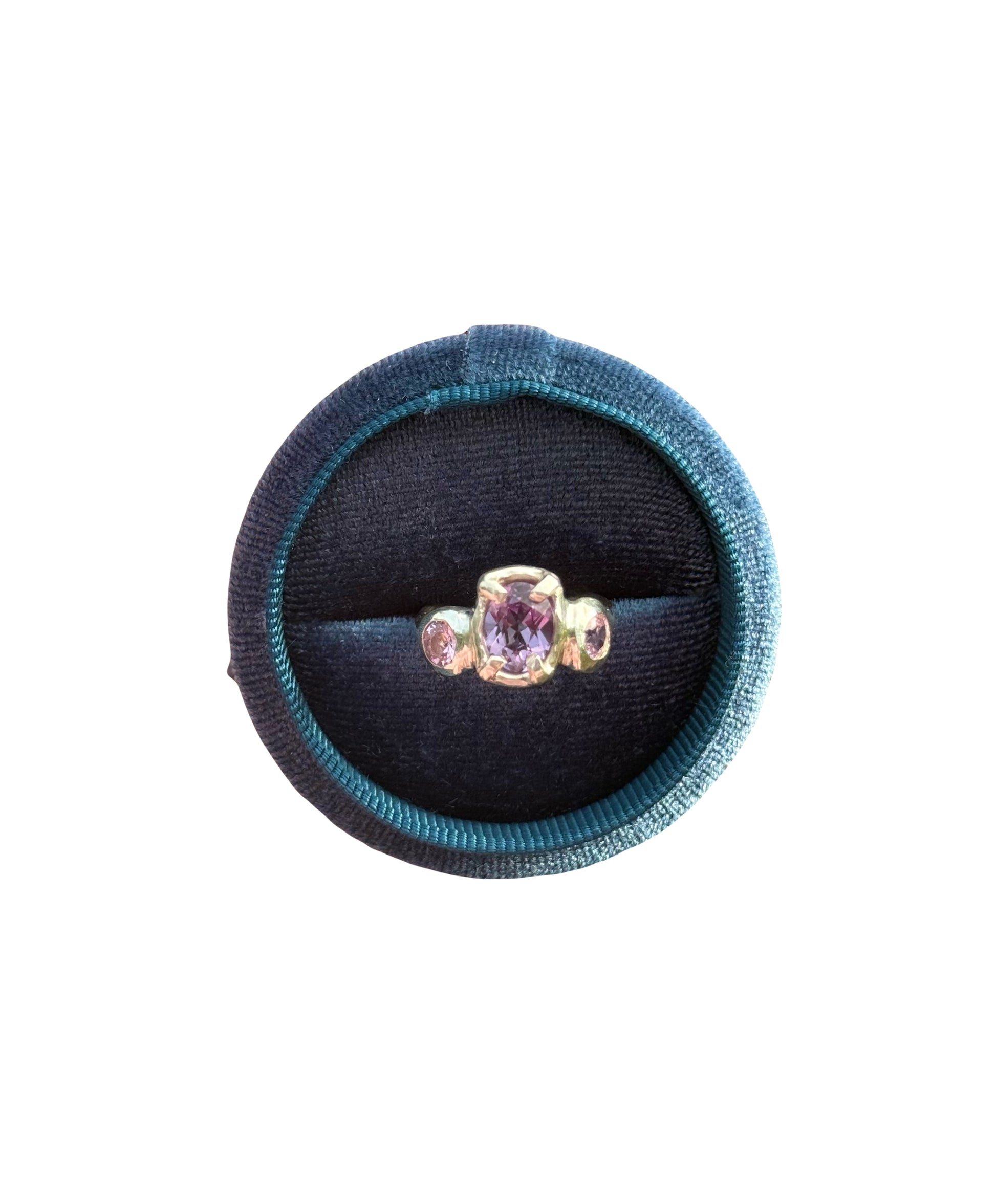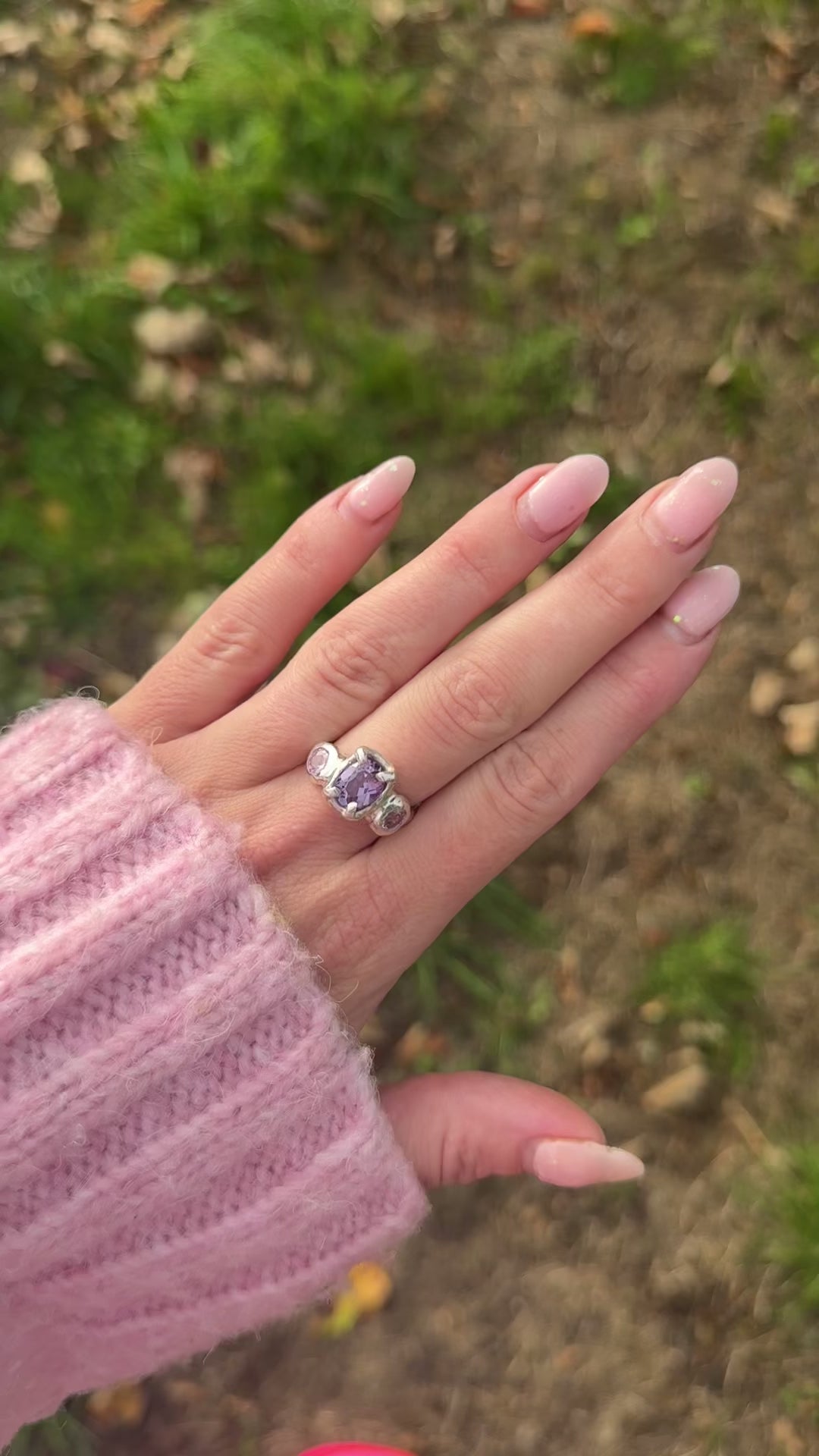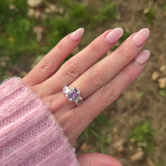 The Whimsy Ring is a one-off wonder crafted in sterling silver, featuring a natural iridescent purple alexandrite at its centre. On either side, a soft pink sapphire adds a delicate pop of colour. This ring feels both magical and beautifully understated.