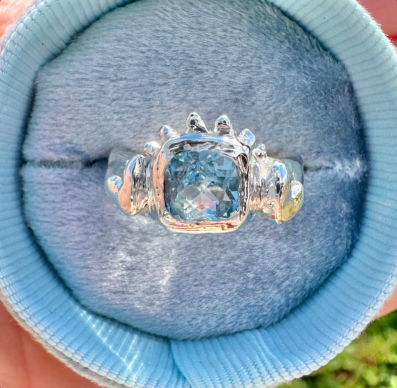 Our made-to-order Ice Queen ring features a beautiful blue sparkly Topaz handset into sterling silver, accented with two sterling silver hearts.