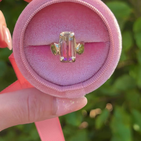 Watermelon Ring a radiant treasure set in 9ct solid yellow gold, this One-Off Wonder ring showcases the most beautiful unique watermelon tourmaline, glowing with pink and green tones that blend effortlessly together. With fresh green peridots on either side, it’s a celebration of vibrant colour and natural beauty. A real one-of-a kind piece that is super special.