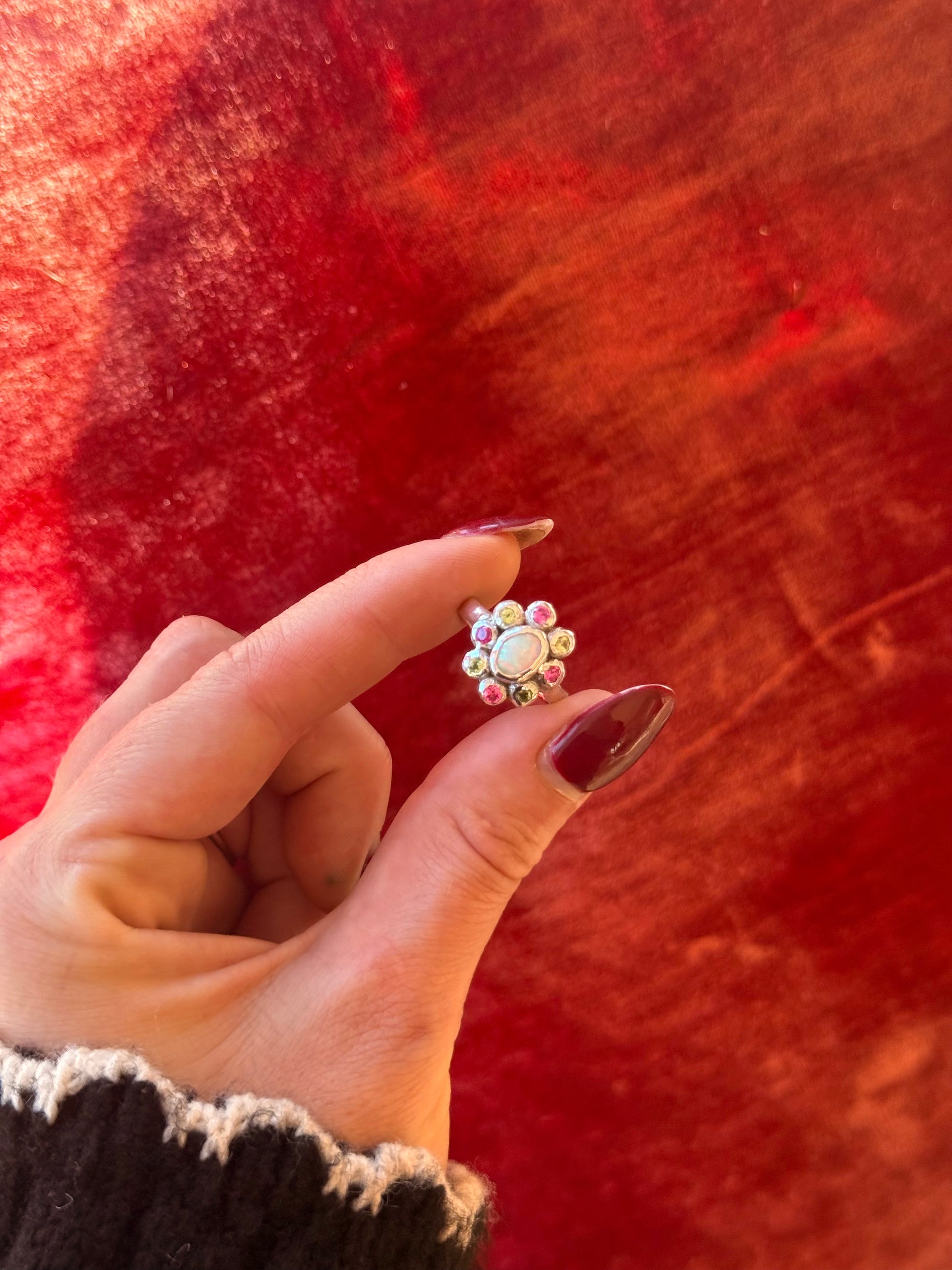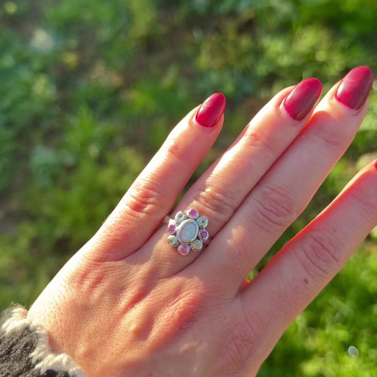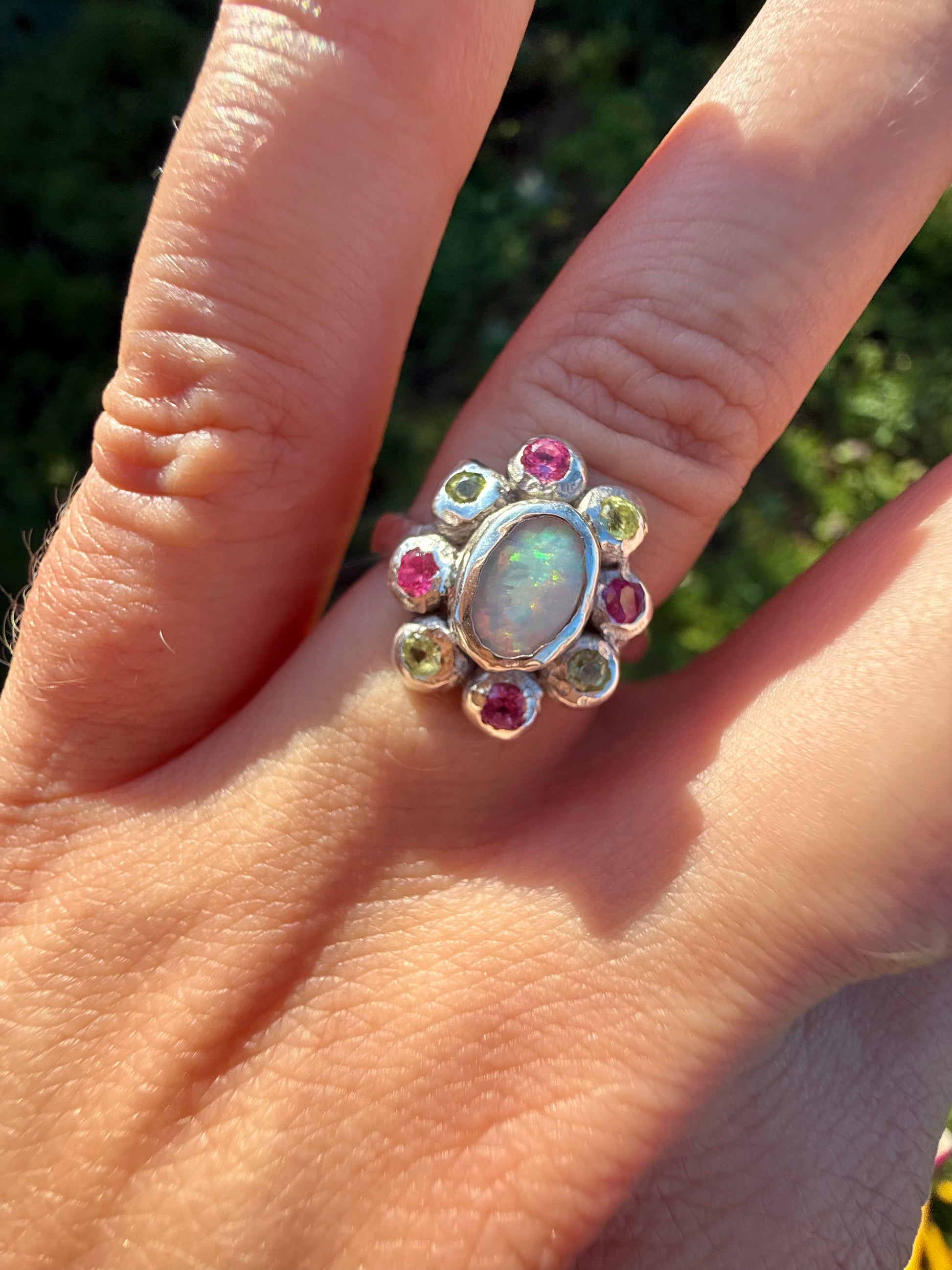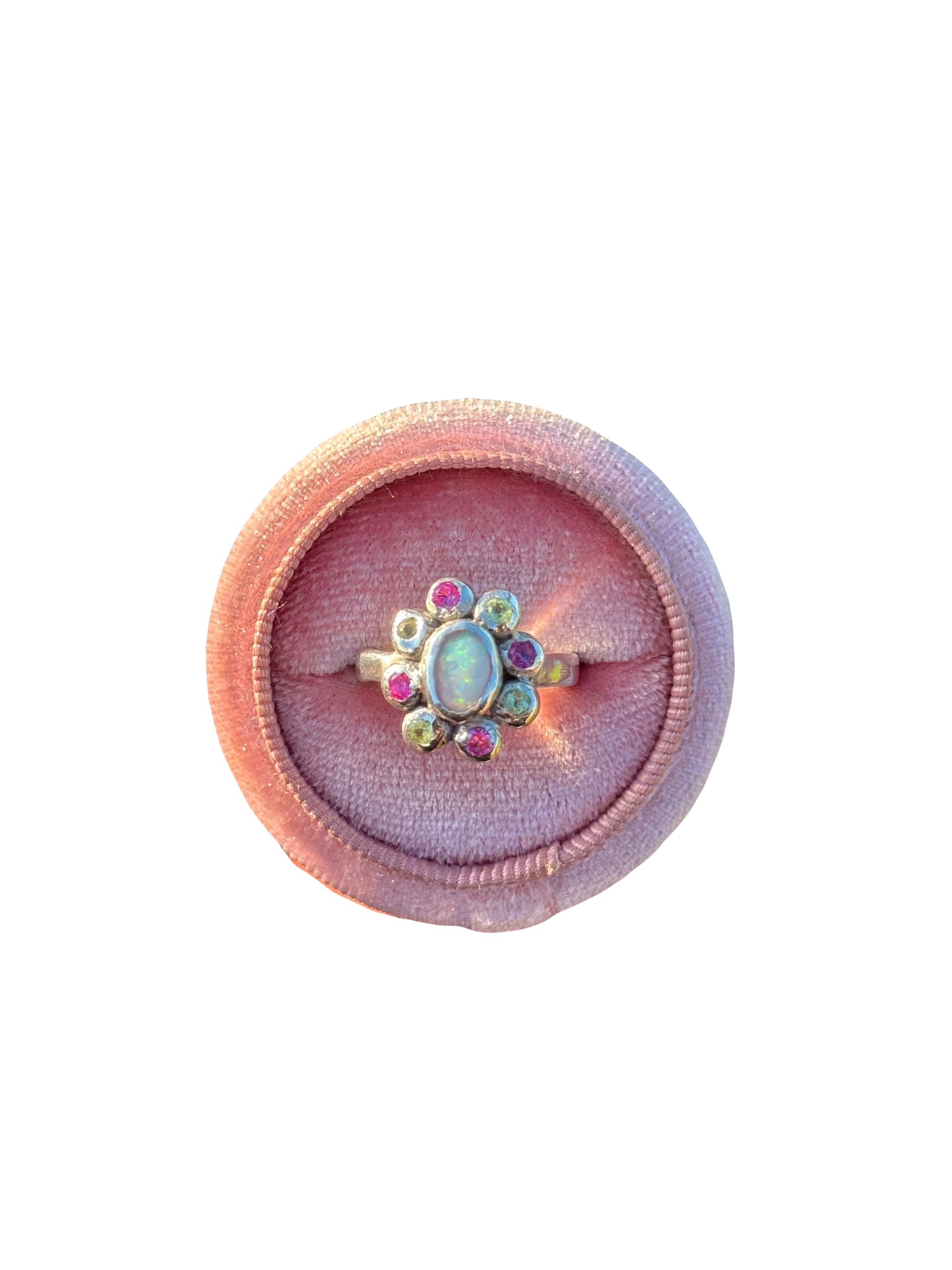 Introducing our made-to-order Lily Of The Valley Ring, featuring a centred solid Australian opal, surrounded by pink sapphires and green peridots. All lovingly handset, in your choice of sterling silver or solid gold. We love with this unique flower design and the vibrant colour combinations - she’s stunning.