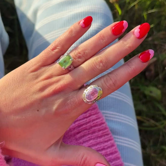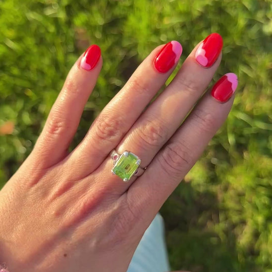 The one of a kind Matcha Ring is handcrafted in solid sterling silver and features a striking baguette-cut peridot in a bold, chunky claw setting. Vibrant hot pink rubies adorn her sides, creating a deliciously playful contrast. We love the vivid green of this stone, fresh, joyful, and full of energy.