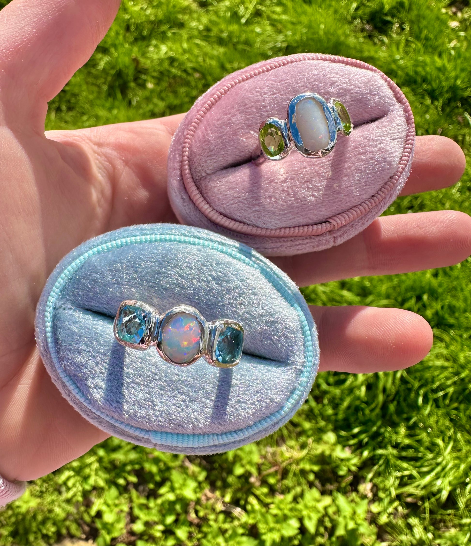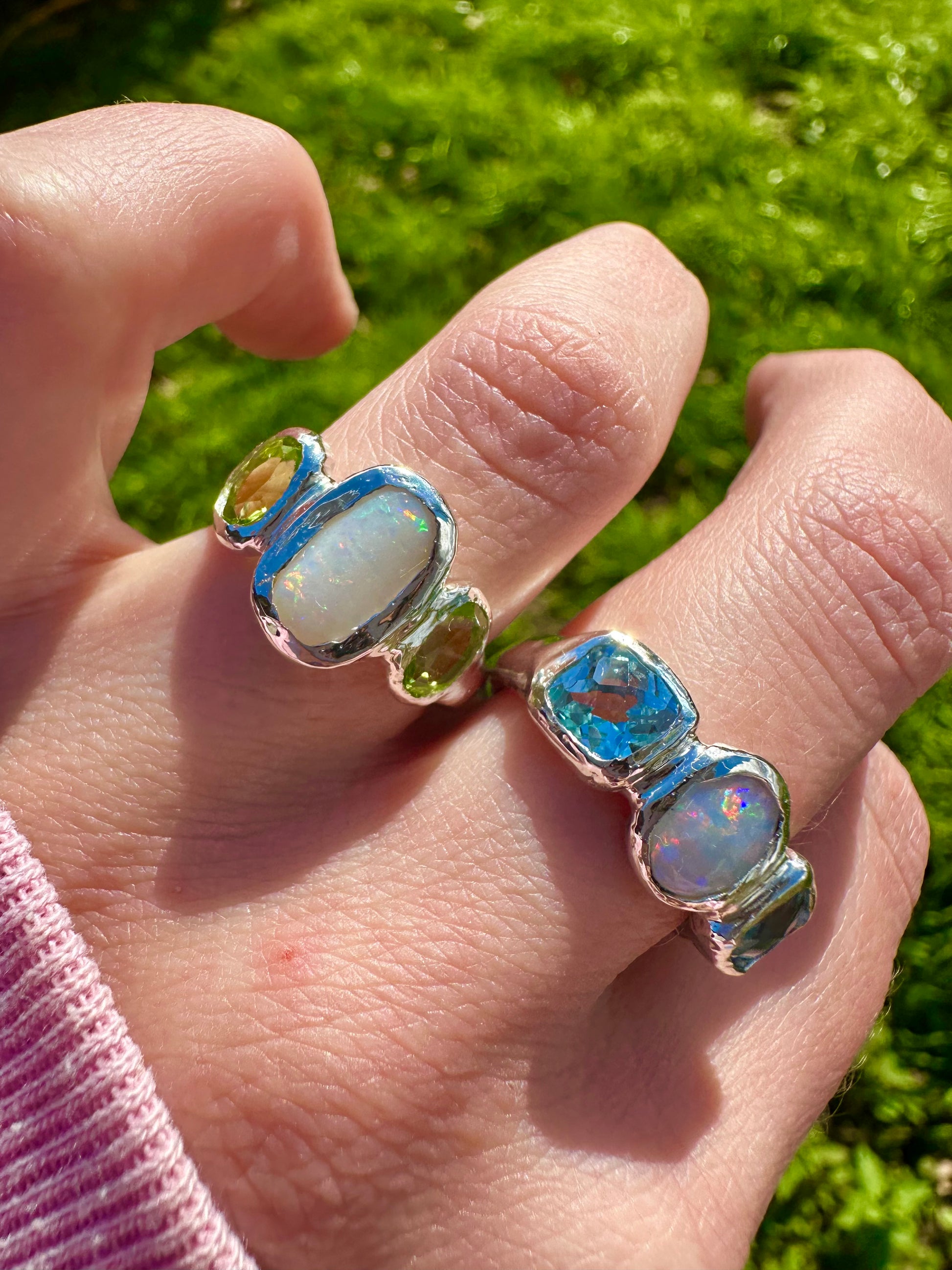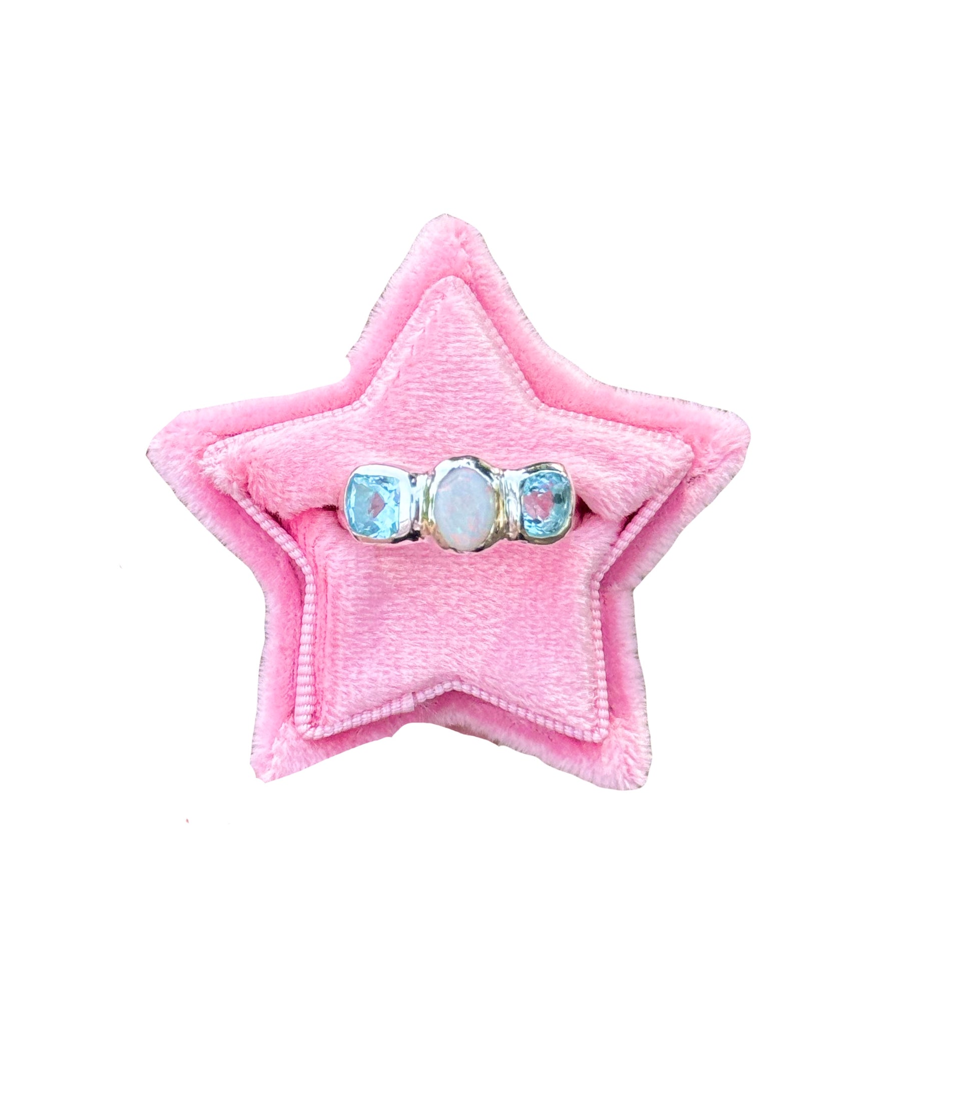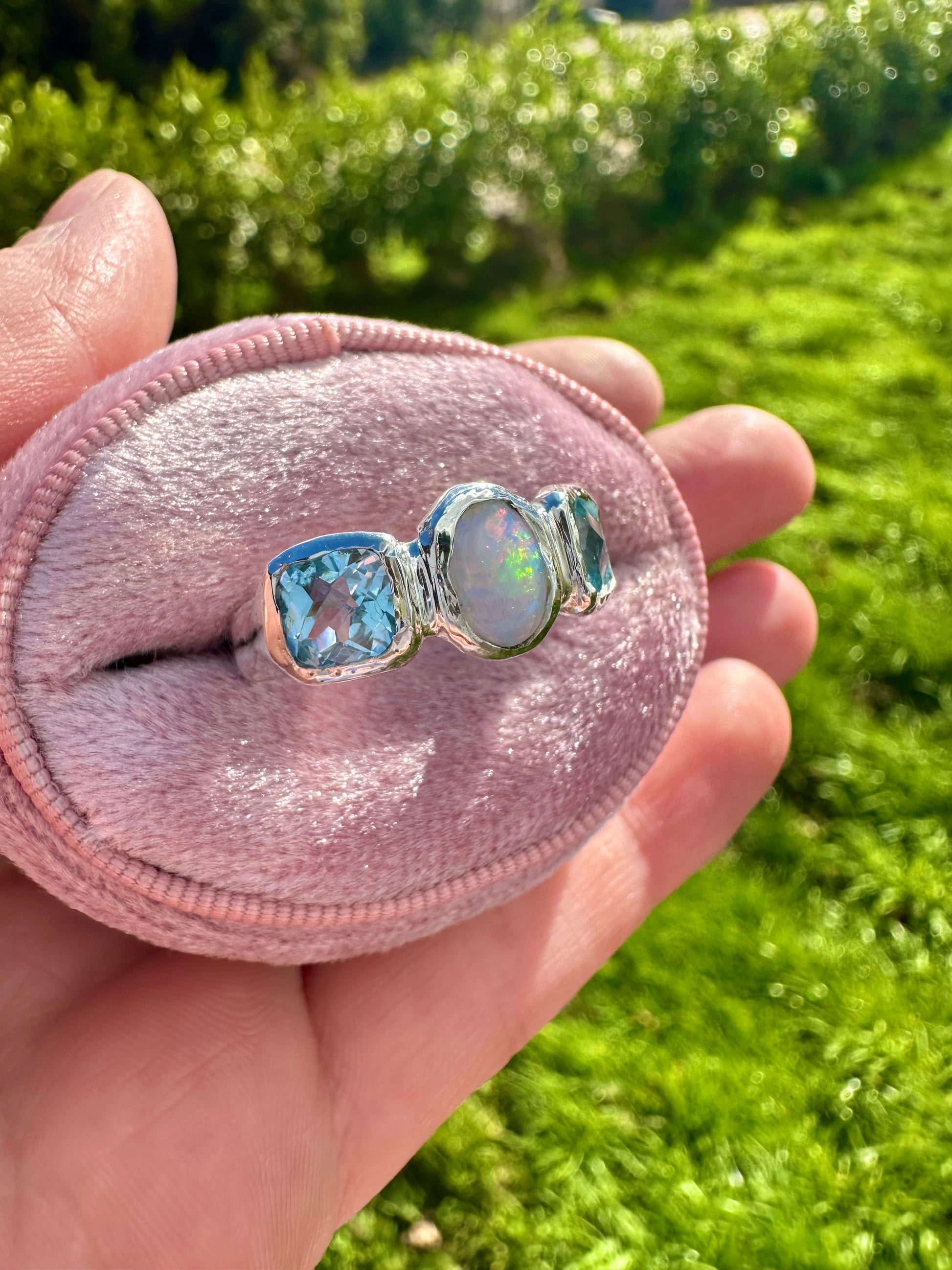 Our made-to-order Ocean Opal ring features two beautiful sparkly Topaz stones and a solid Australian Opal in the centre, all handset into recycled sterling silver. If you would like this piece in solid gold please contact us.