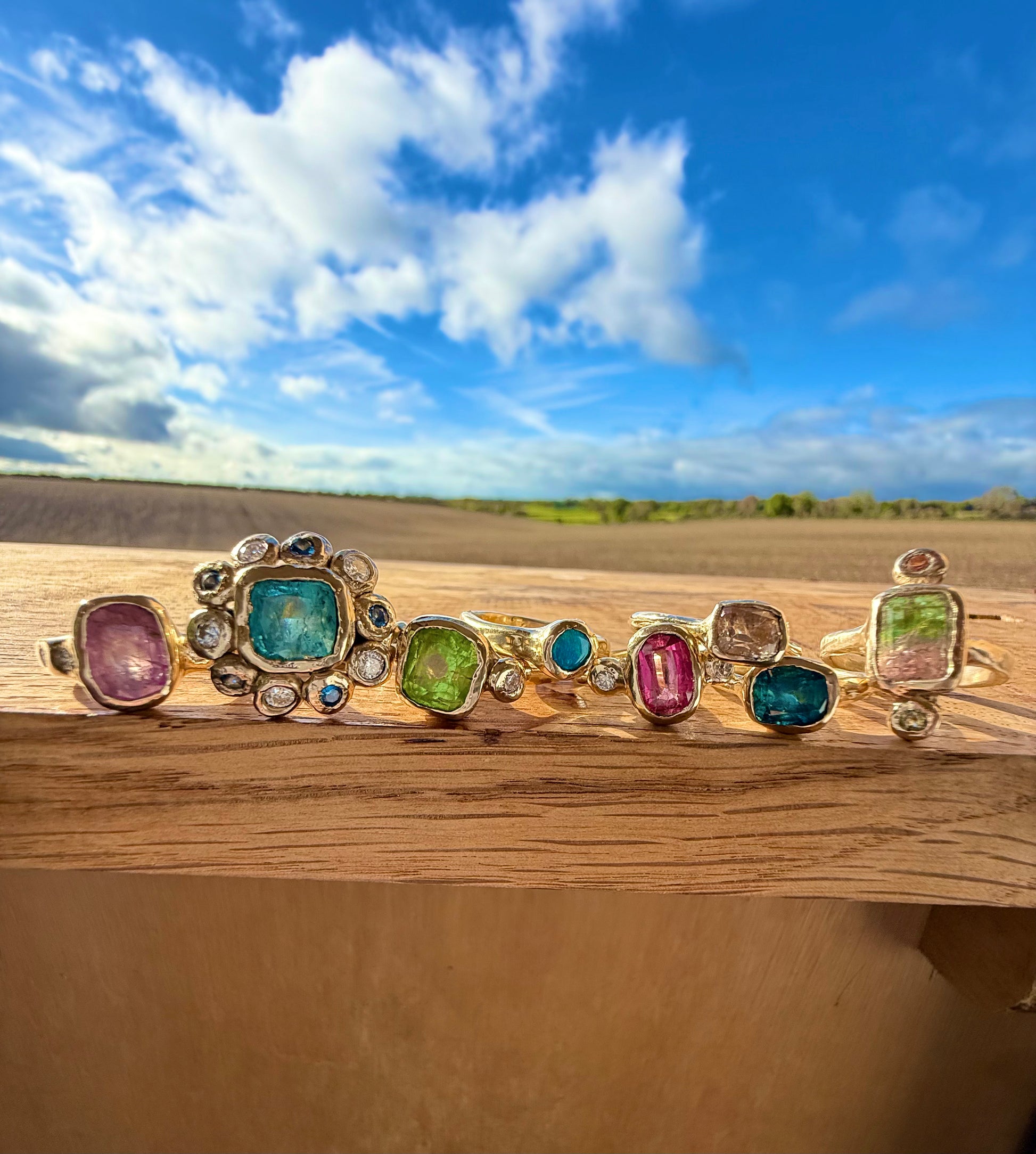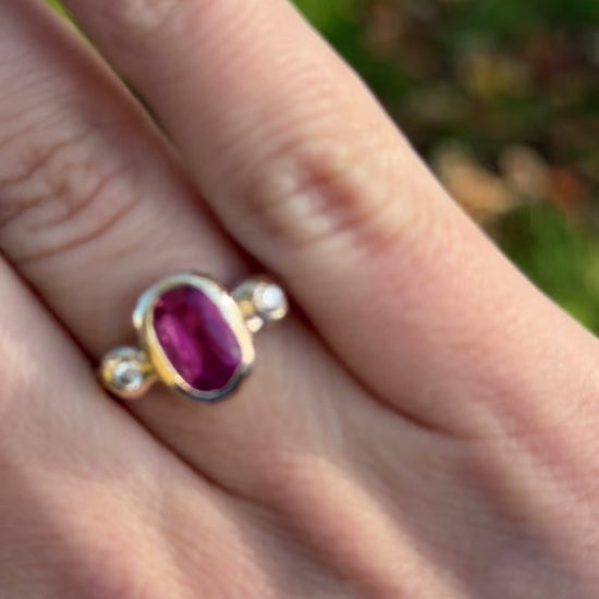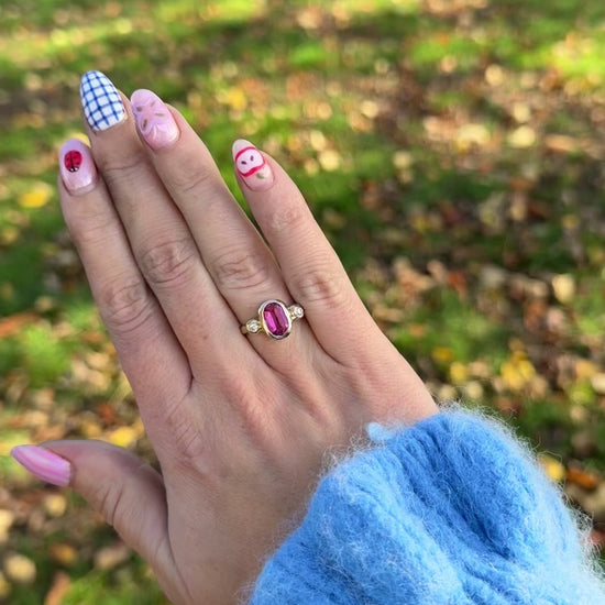 Our new one-off wonder Cherry Pie Ring. This 9ct solid yellow gold ring showcases a rich cherry-coloured tourmaline at the centre and a diamond on each side. The deep pink tones of the tourmaline contrast beautifully with the warm gold band, while the diamonds add just the right amount of sparkle. We love the sweetness of this ring.