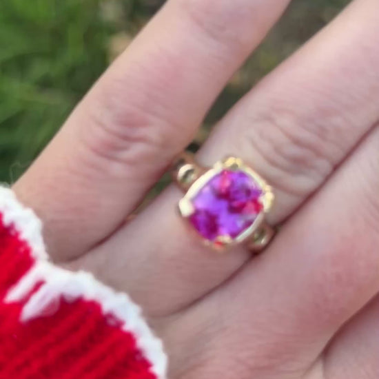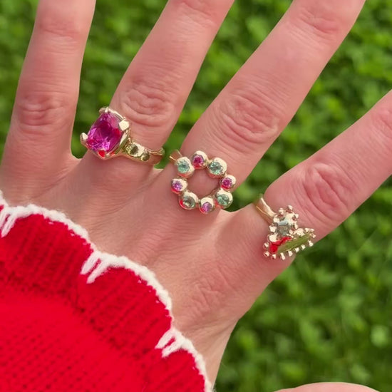 Our made-to-order Pixi Ring is available in your choice of solid yellow gold or sterling silver, featuring a vibrant Sapphire with side delicate Peridots. We love the bold, chunky claw setting, it gives this piece its distinctive character and charm.