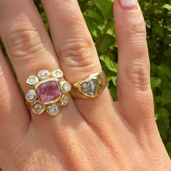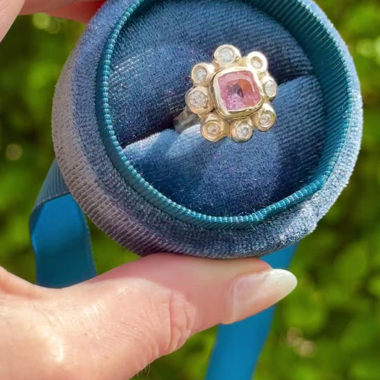 Introducing The Rose Ring – A One-of-a-Kind Treasure with a breathtaking natural powder pink tourmaline takes centre stage. Encircled by dazzling diamonds for extra sparkle, all lovingly set in solid 9ct yellow gold. We are obsessed with this ring