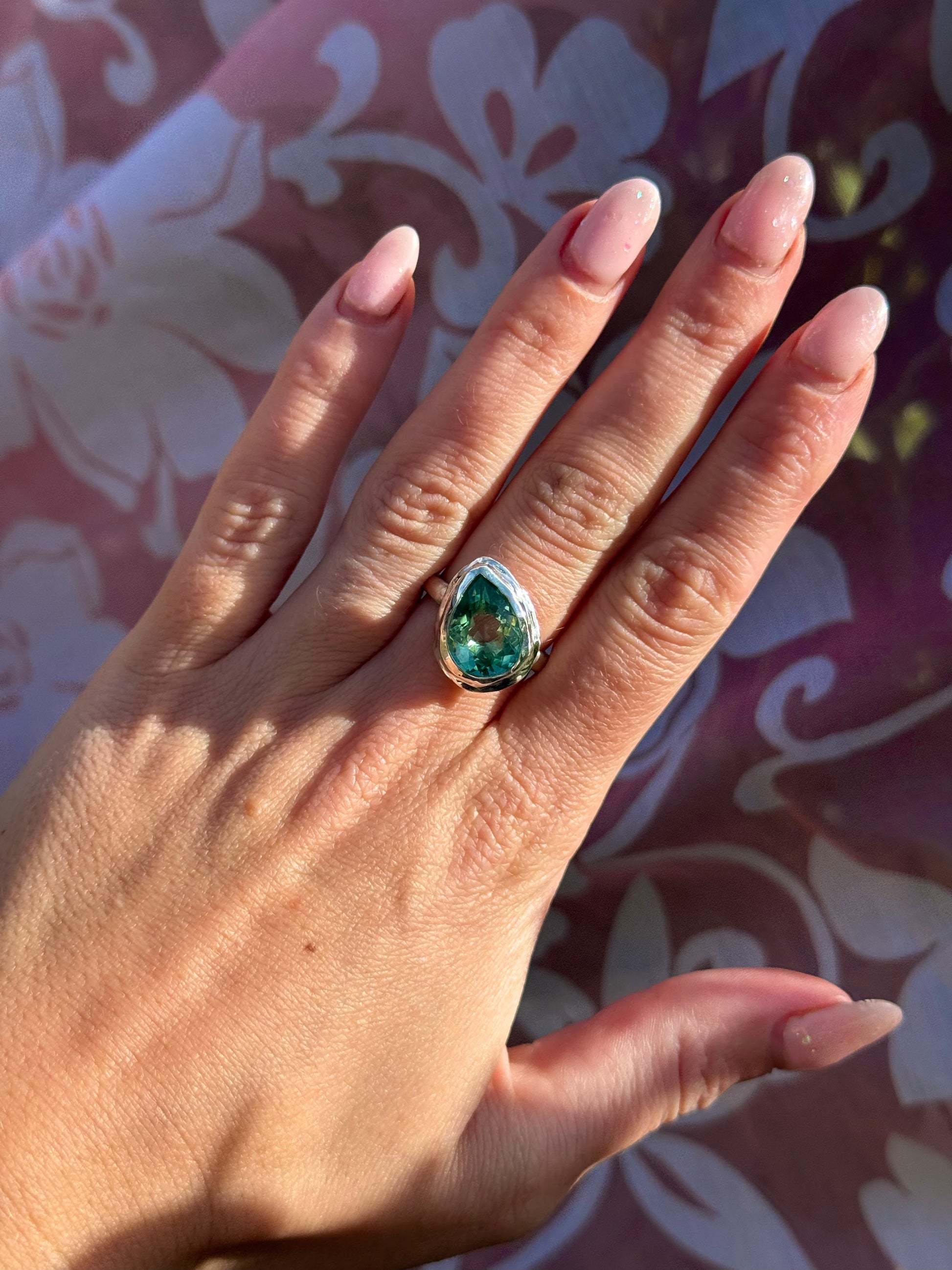 Willow is a One-Off Wonder sterling silver ring, set with a striking 12x8mm pear-cut parti sapphire in a refreshing mint green hue. We love the soft, flowing shape of the stone paired with its cool tones.