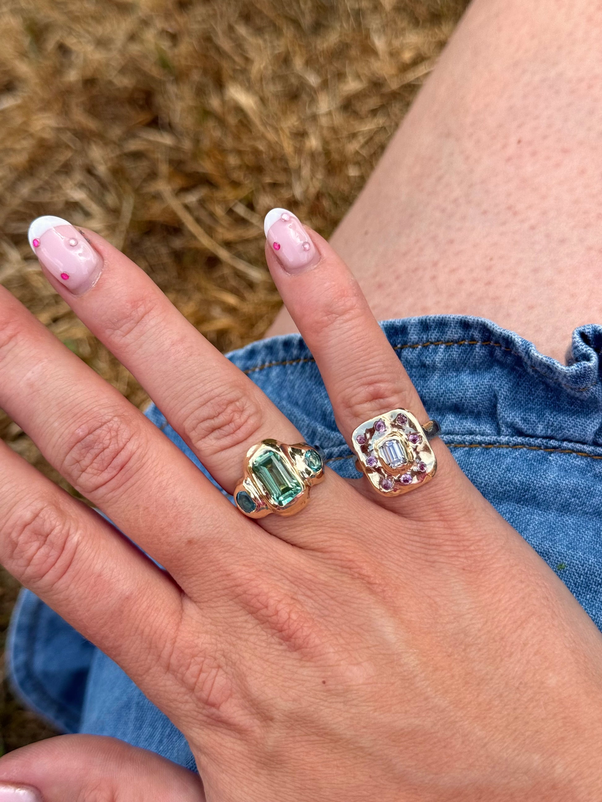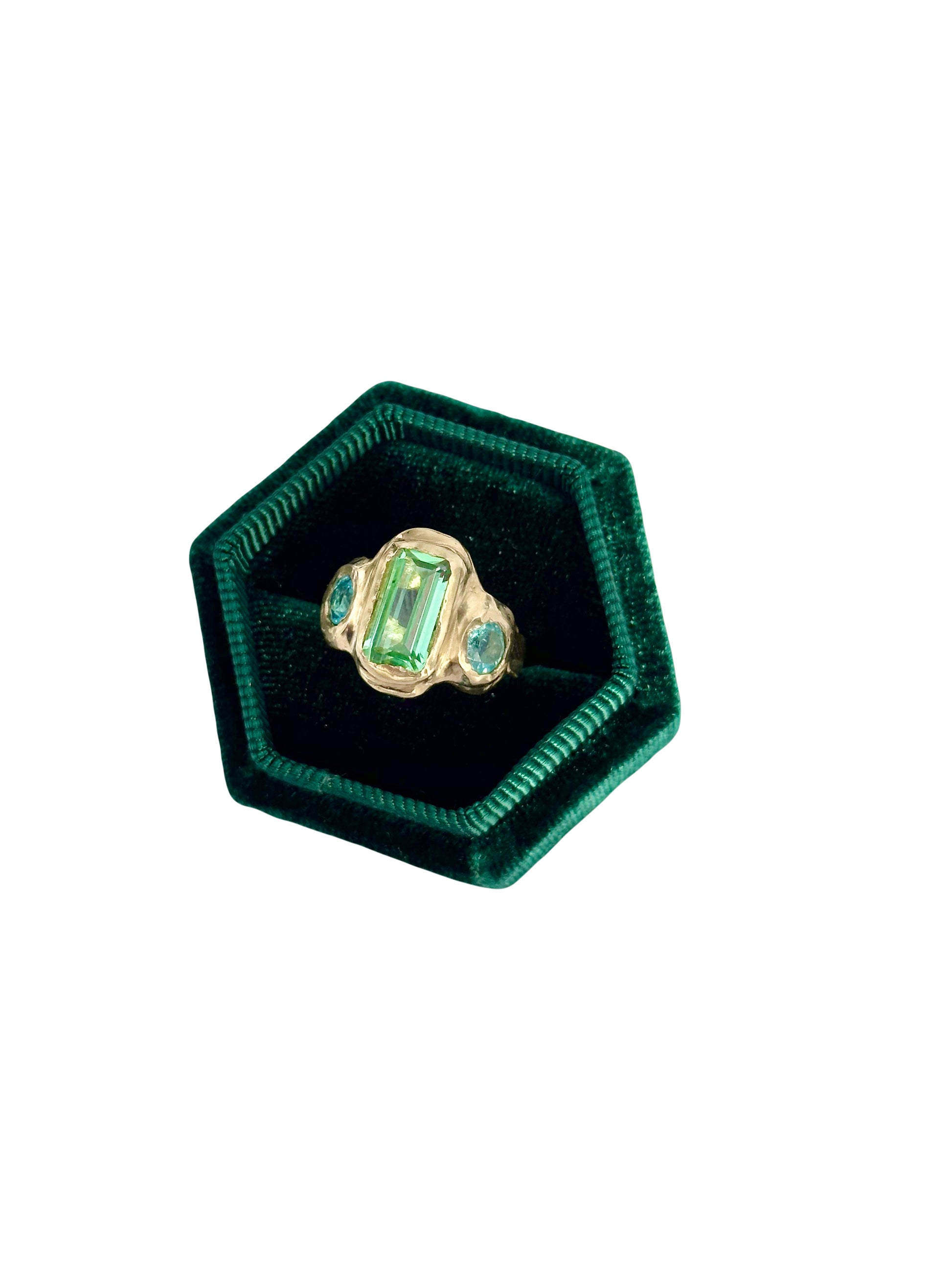 The Mermaid Ring in 9ct gold features a stunning natural tourmaline at its centre, with natural apatites on either side. The rich, earthy tones of the tourmaline are beautifully complemented by the vibrant blue-green hues of the apatites, creating a striking contrast. This elegant design, set in chunky 9ct yellow gold, offers a unique and refined look, perfect for adding a touch of natural beauty to any collection.