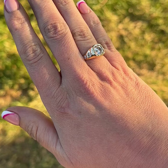 Our Made-to-Order Darling Diamond ring is a cushion-cut lab-grown diamond in the centre, with two smaller lab diamonds on either side for extra sparkle.