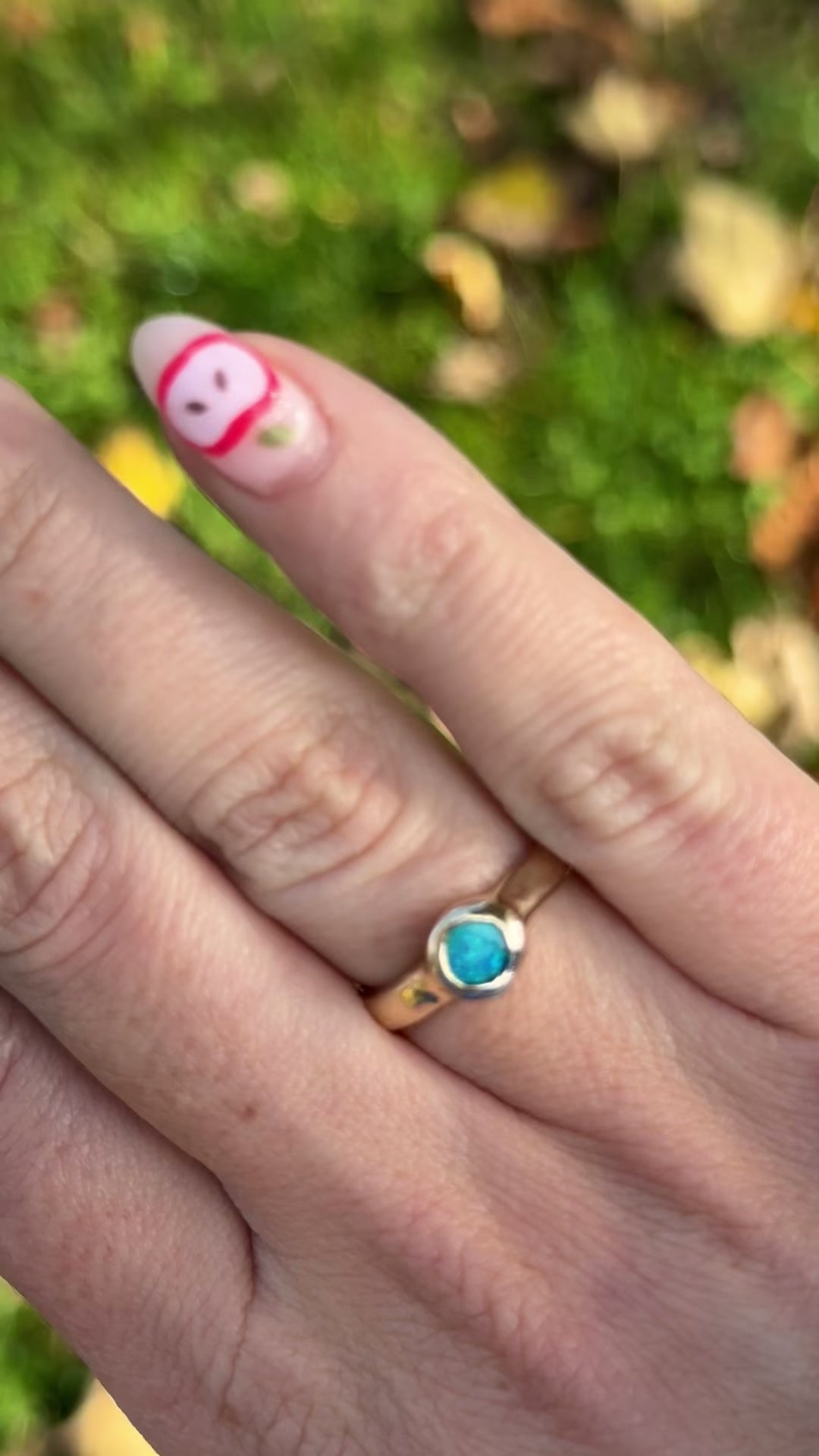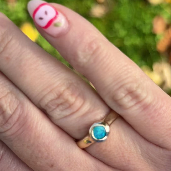 Meet Kaia, a one-of-a-kind treasure crafted in solid 9ct yellow gold. At the centre of this stunning piece sits a natural round Australian blue opal, known for its mesmerising play of colour. With flashes of electric blue and soft aqua, Kaia brings a little magic to the everyday.