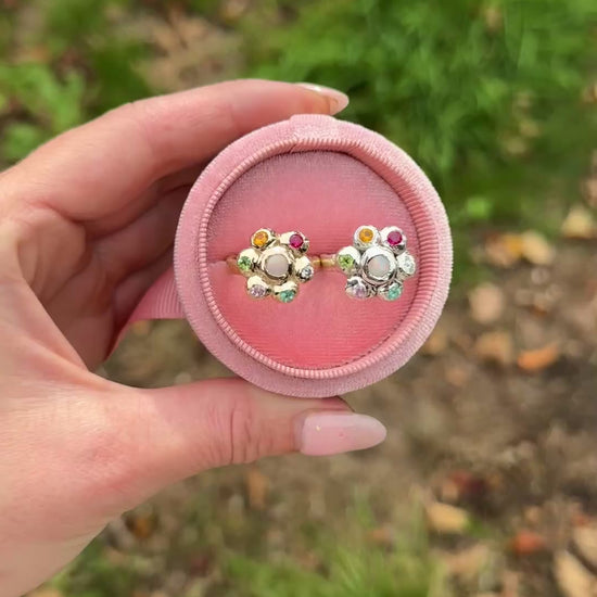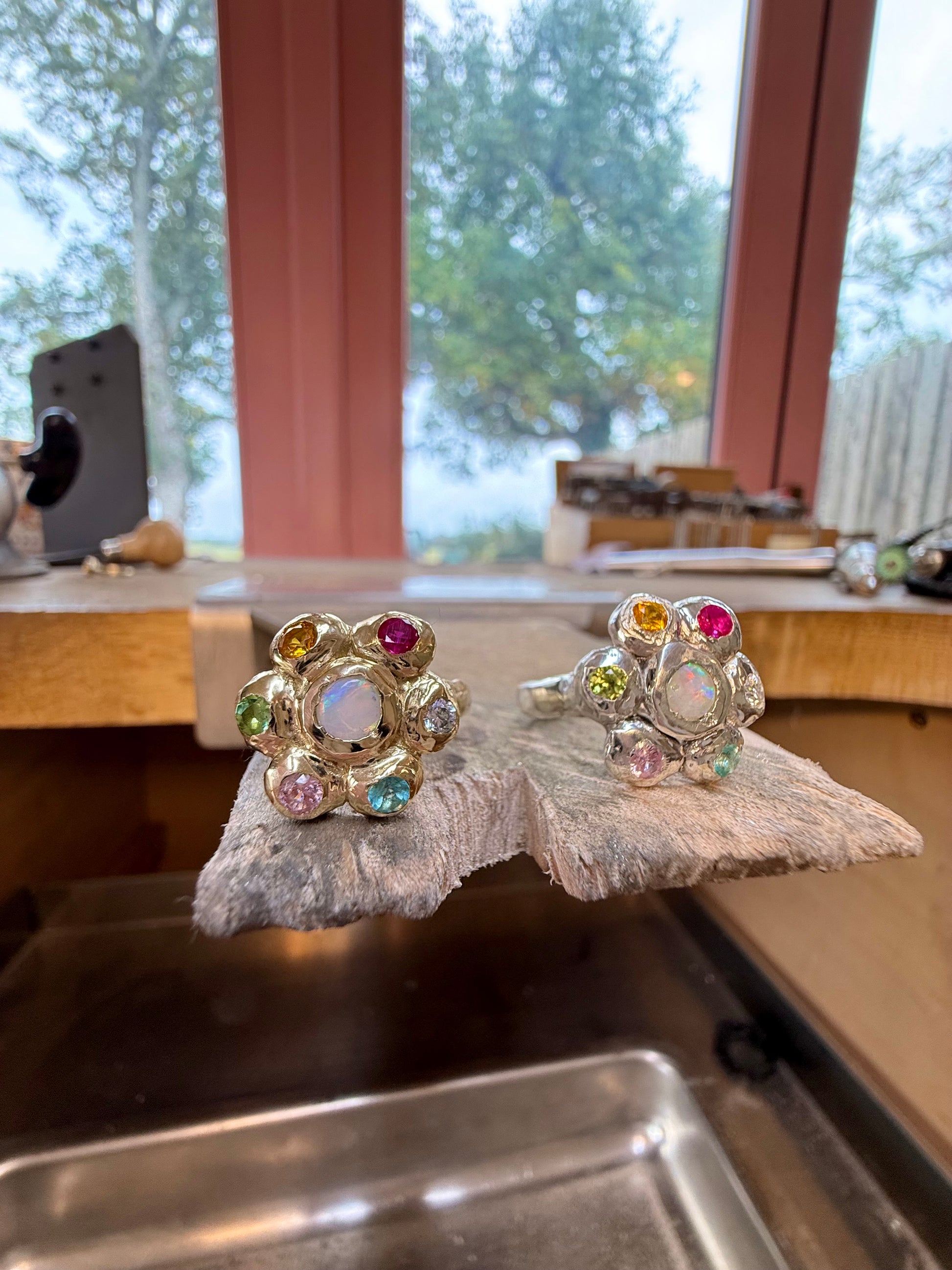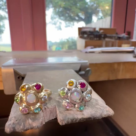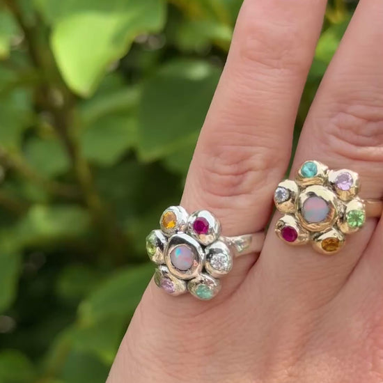 Introducing The Daisy Ring, now part of my made to order collection. This ring features a natural Austrian Opal at its centre, surrounded by petals of Sapphires, Peridot, Diamond, and Ruby. We love this sweet design – she goes with everything. Available in 9ct yellow solid gold or sterling silver.