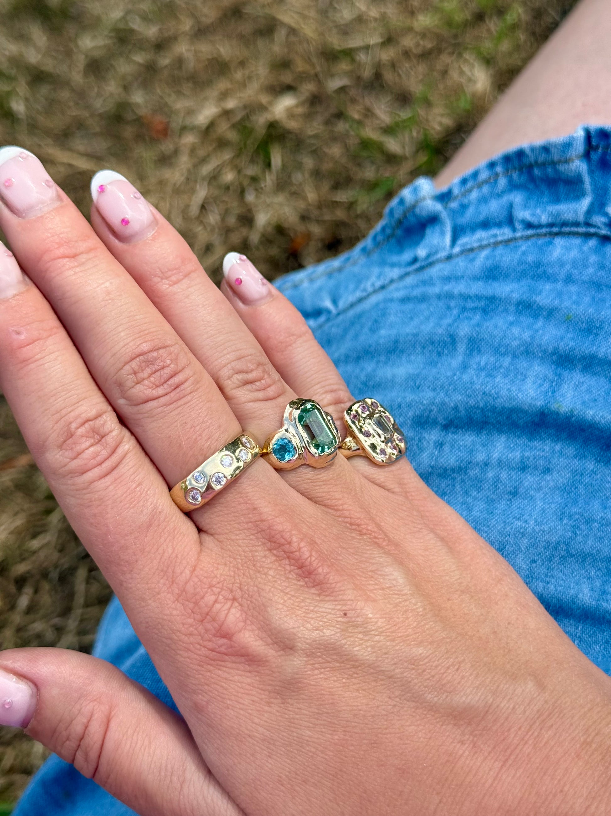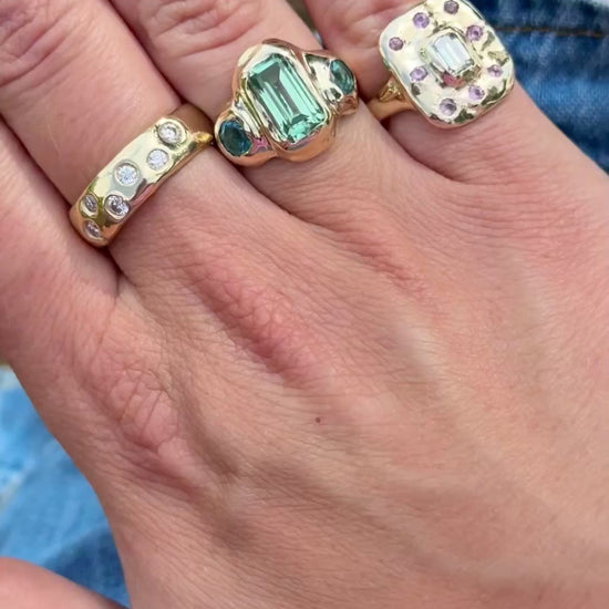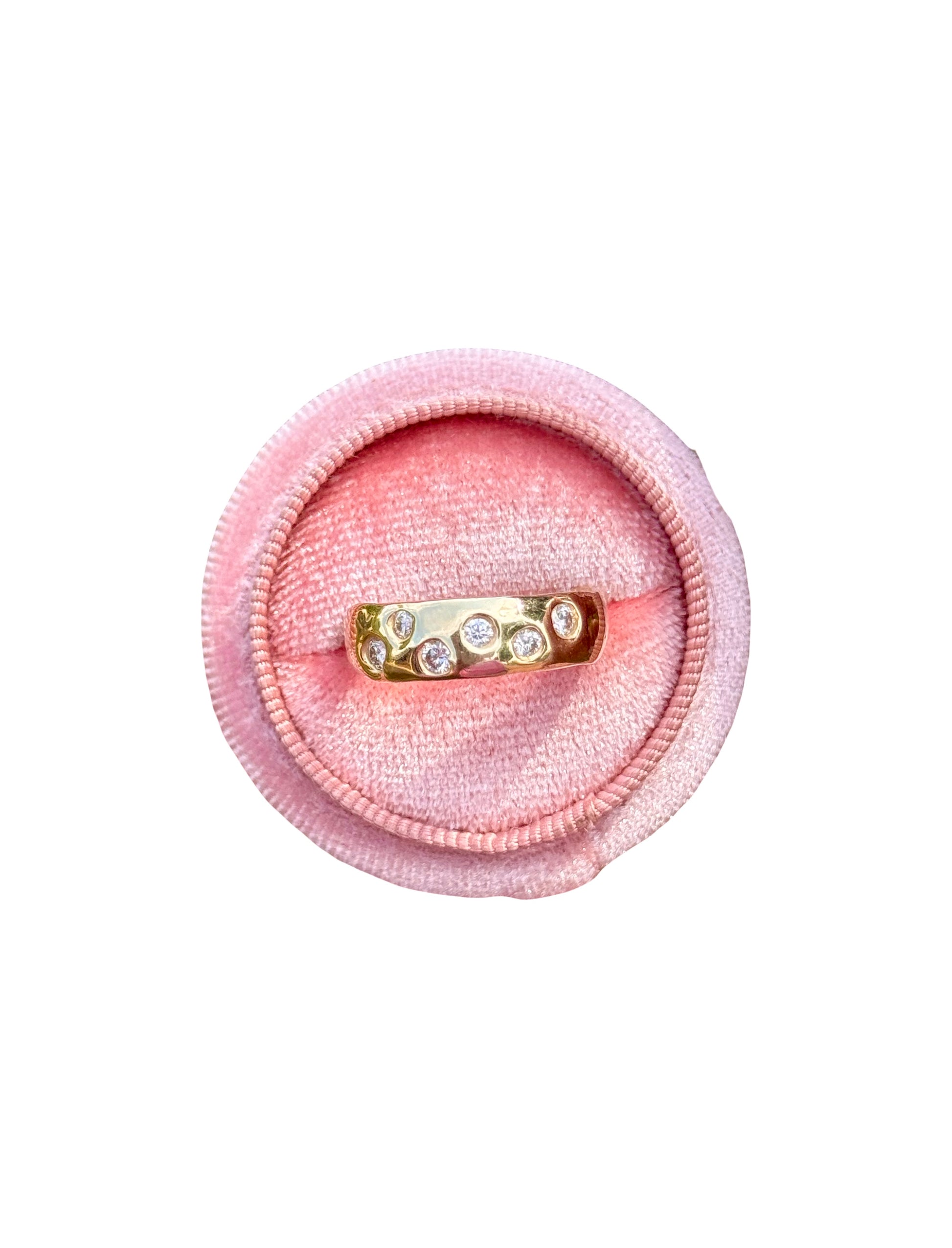 The Diamond Scatter Ring is a stunning 9ct gold piece featuring six delicate lab diamonds scattered across the band, adding a subtle sparkle from every angle. We are loving the chunky organic band.