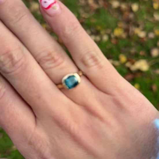 Delicate in form but rich in colour, The Teal Ring is crafted in 9ct solid yellow gold and features a stunning deep blue tourmaline at its centre. Though dainty in design, the rich tones of the gemstone bring depth, creating a beautiful contrast against the warm gold band.
