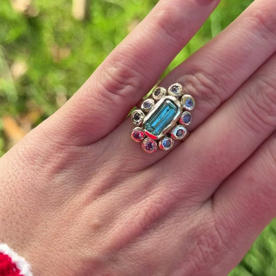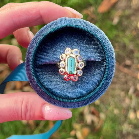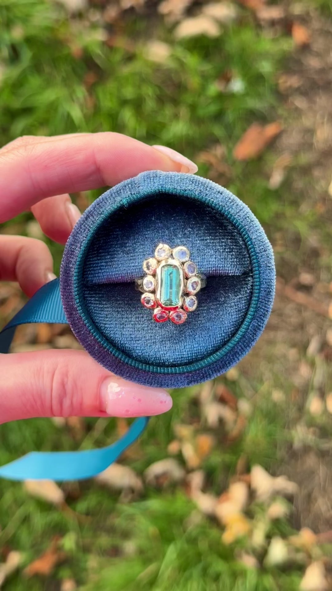 Introducing the Blue Lotus Ring a new addition to our One-of Wonder collection. Set in 9ct solid yellow gold, this ring features a glowing mint-green tourmaline at its centre, framed by soft Cornish blue tanzanites. The fresh, cool tones against warm gold create a look that’s both striking and serene, a true statement piece with a calm, dreamy feel.