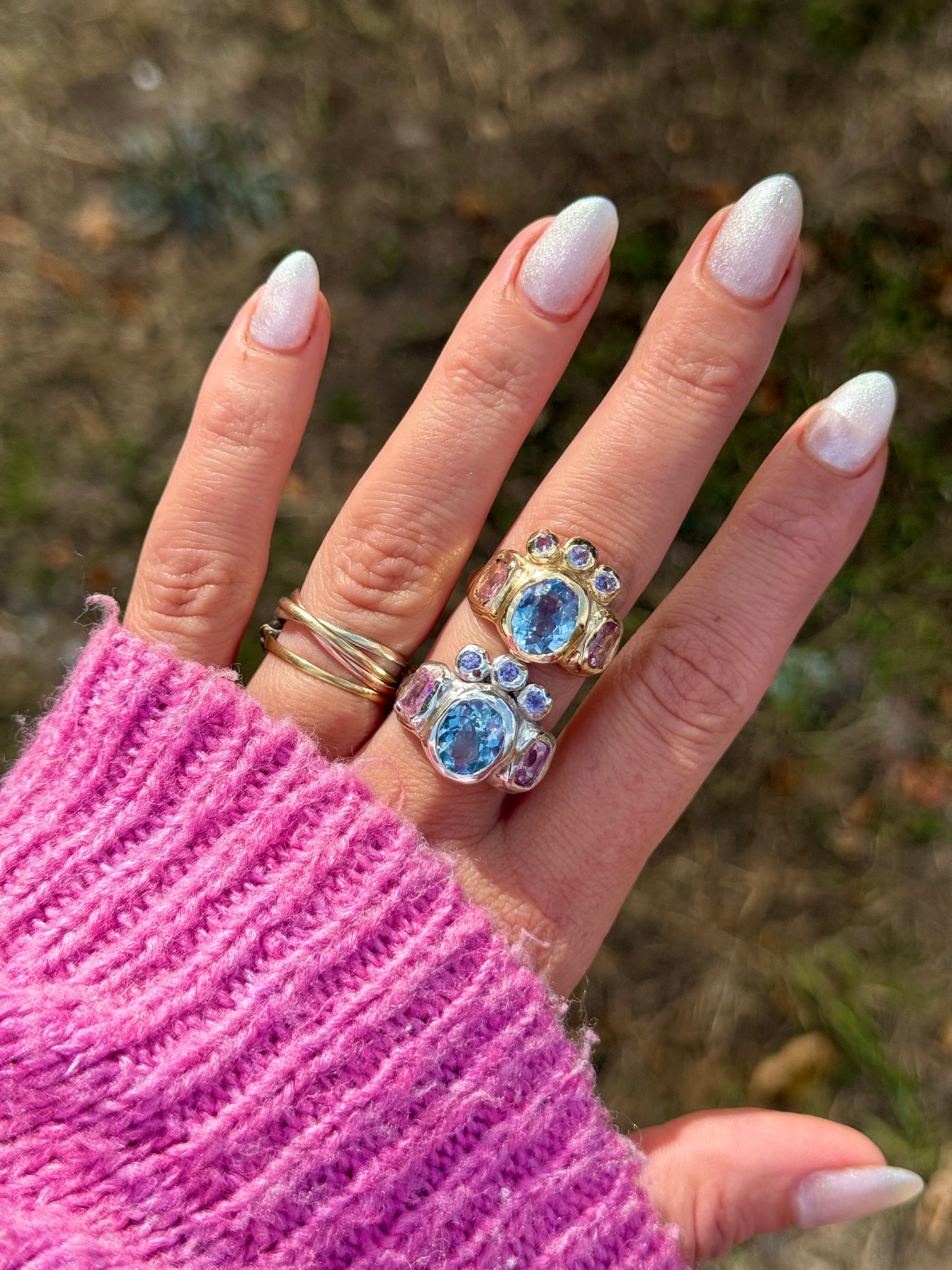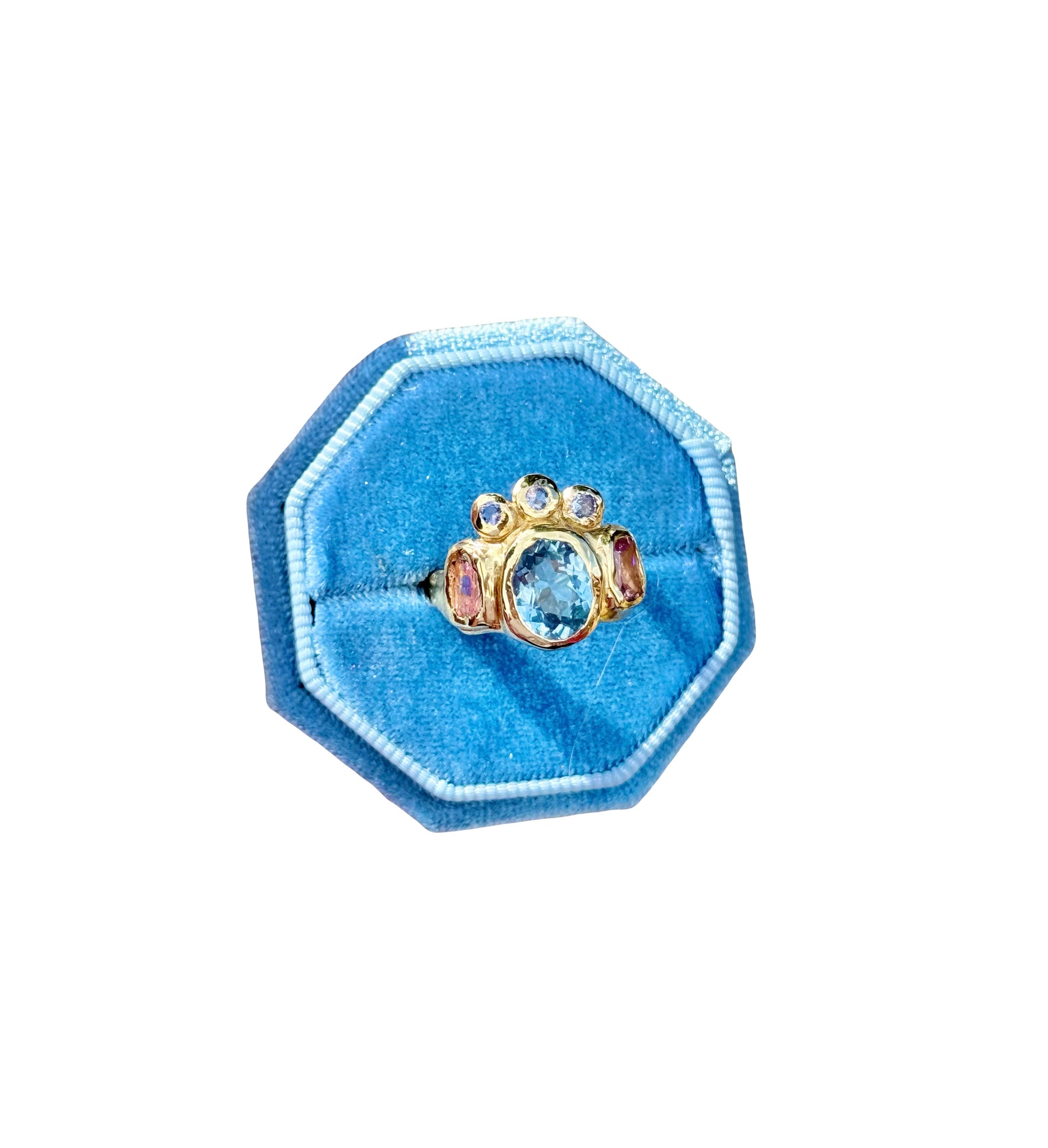 Introducing our made-to-order “Tiara Ring” a design we love so much, we had to offer it as a permanent piece. Featuring a natural Aquamarine at its centre, this regal ring is accented with pale pink Sapphires on either side and crowned with delicate blue Tanzanites. Available in your choice of solid gold or sterling silver, the Tiara Ring brings a dreamy, heirloom feel to any collection.