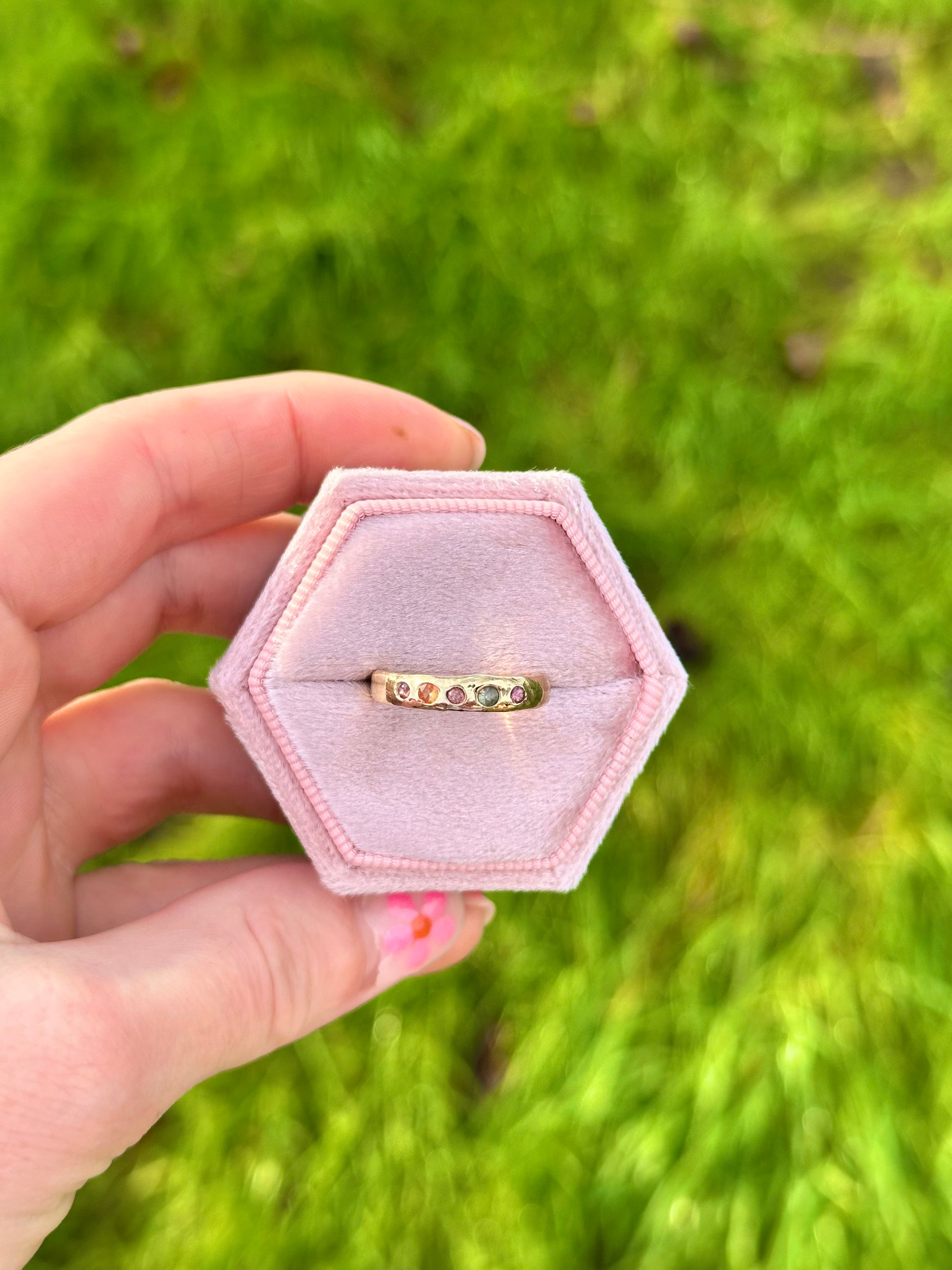 Our one-of-a-kind Twinkle Ring. This cute band features a beautiful array of natural sapphires, set in solid 9ct yellow gold and meticulously handcrafted. Its elegant design makes it ideal for stacking with other rings or wearing solo. The sapphires create a delicate rainbow effect, adding a touch of brilliance to any look.