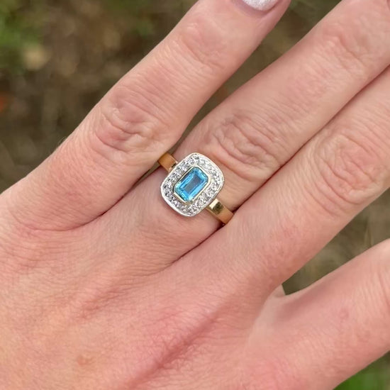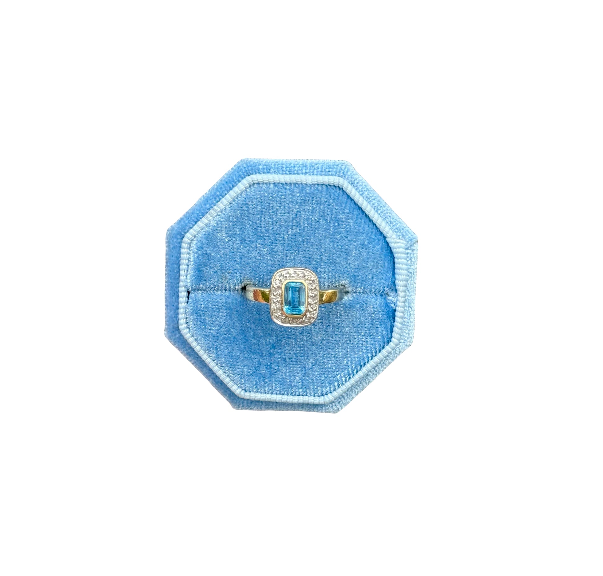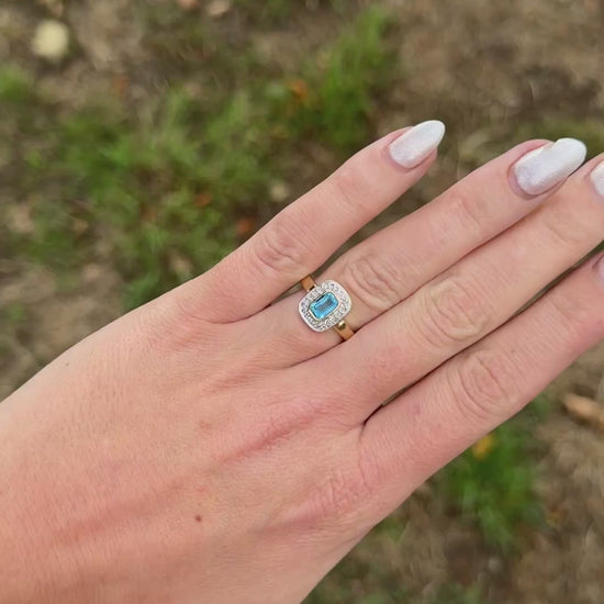 Introducing our new beautiful vintage find by Molly: This charming vintage blue sapphire ring, expertly handcrafted in the 1990s, showcases a striking natural blue sapphire, accented by little diamonds and set in solid 9ct yellow gold. We love the elegant rectangle shape of this design, making it the perfect statement piece. A timeless treasure that beautifully blends elegance and craftsmanship. All vintage pieces come with legal hallmarks.