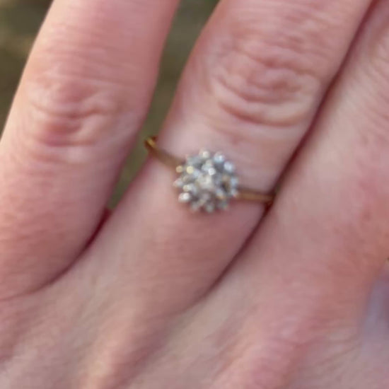Discover our latest vintage treasure by Molly: This exquisite vintage natural diamond ring features a stunning flower design, crafted in solid 9ct yellow gold with a platinum setting. It is fully hallmarked on the inside of the band, ensuring its authenticity. Handmade in the 1980s.