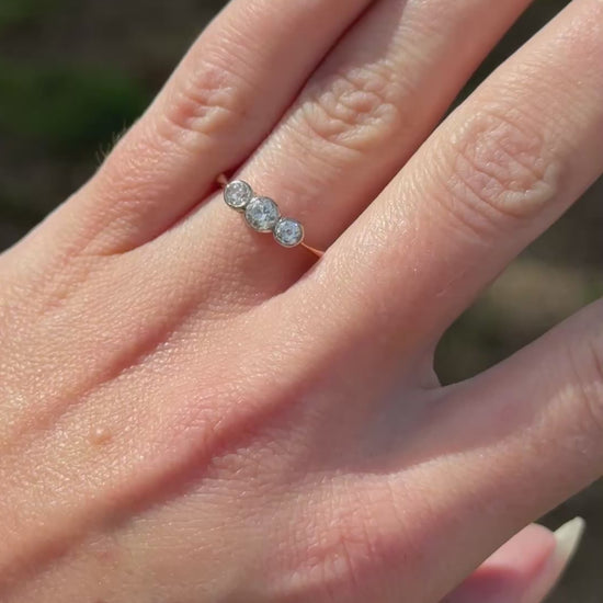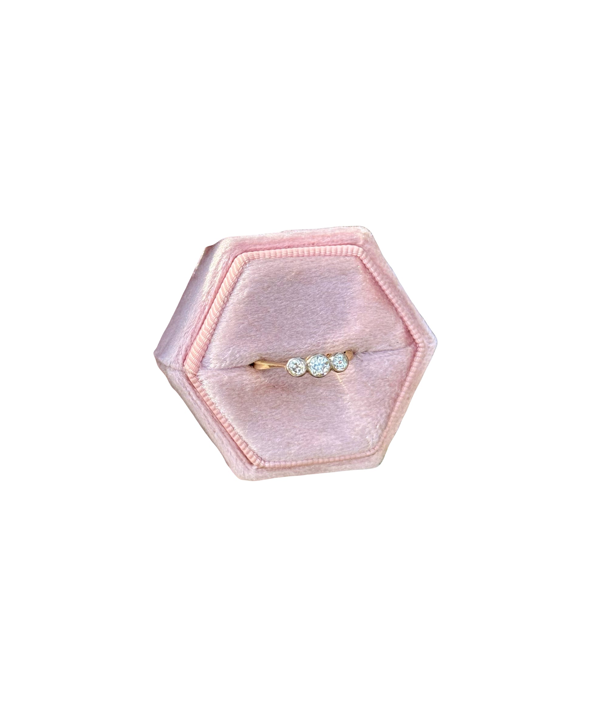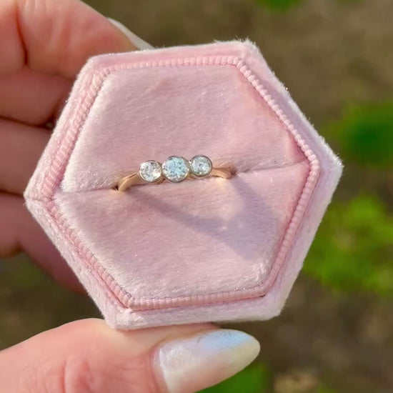 A vintage treasure found by Molly: This Diamond Ring is a stunning three-diamond masterpiece, featuring a trio of natural diamonds in a captivating arrangement. crafted in secure platinum bezel sets, is beautifully complemented by a 18ct yellow gold band, creating a striking mix of elegance and strength. This exceptional ring is a true standout for any collection and you can wear simply on its own or stack with your other favourite rings.